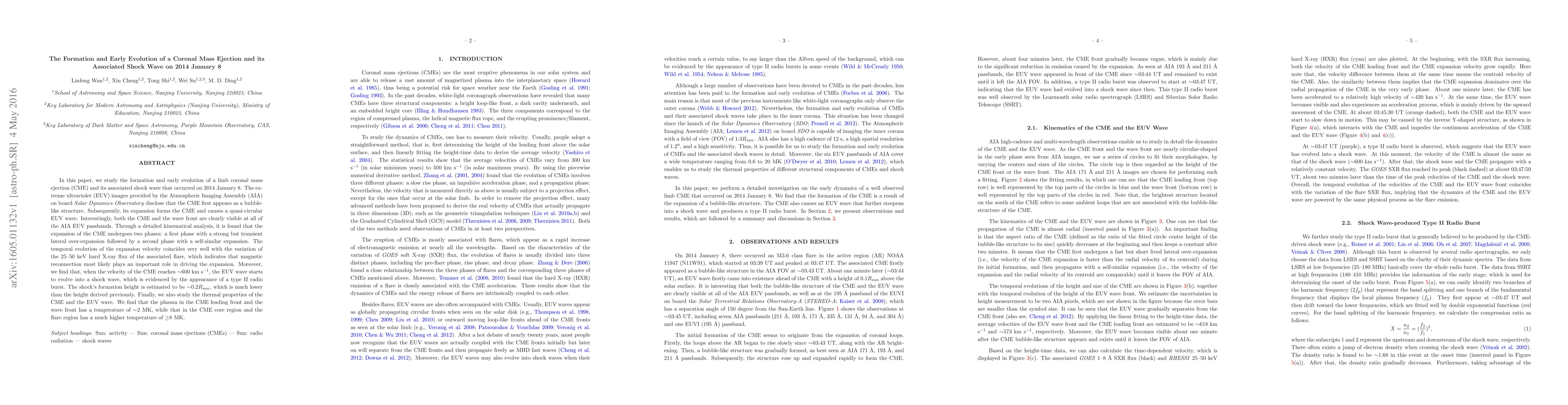 This paper investigates a limb coronal mass ejection (CME) and its associated shock wave on 2014 January 8, revealing a two-phase expansion driven by magnetic reconnection. The shock wave forms at a lower height than previously estimated, and the thermal properties show varying temperatures across the CME and wave front.