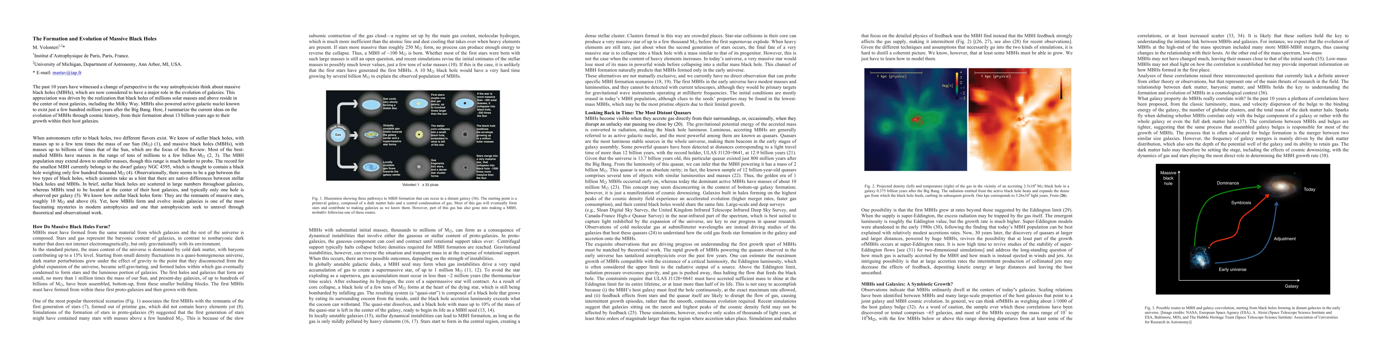 This paper reviews the current understanding of the formation and evolution of massive black holes (MBHs) from their inception around 13 billion years ago to their role in shaping the galaxies they inhabit, highlighting their presence in most galactic centers and their influence on active galactic nuclei.