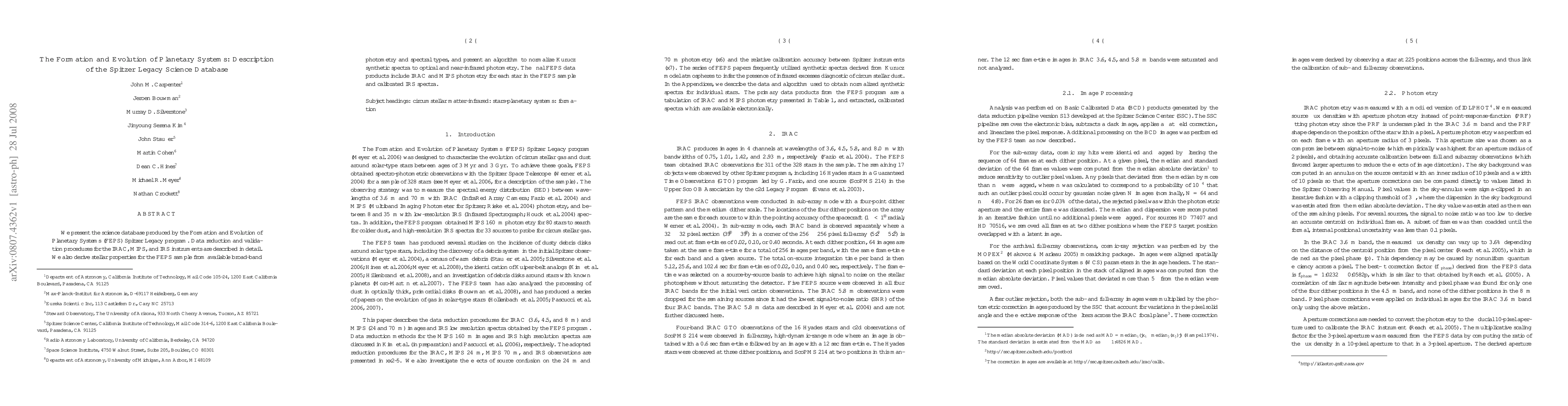 The FEPS Spitzer Legacy program's science database includes detailed data reduction and validation procedures for Spitzer's IRAC, MIPS, and IRS instruments, along with stellar properties derived from broad-band photometry and spectral types. The final products consist of IRAC and MIPS photometry and calibrated IRS spectra for the FEPS sample.