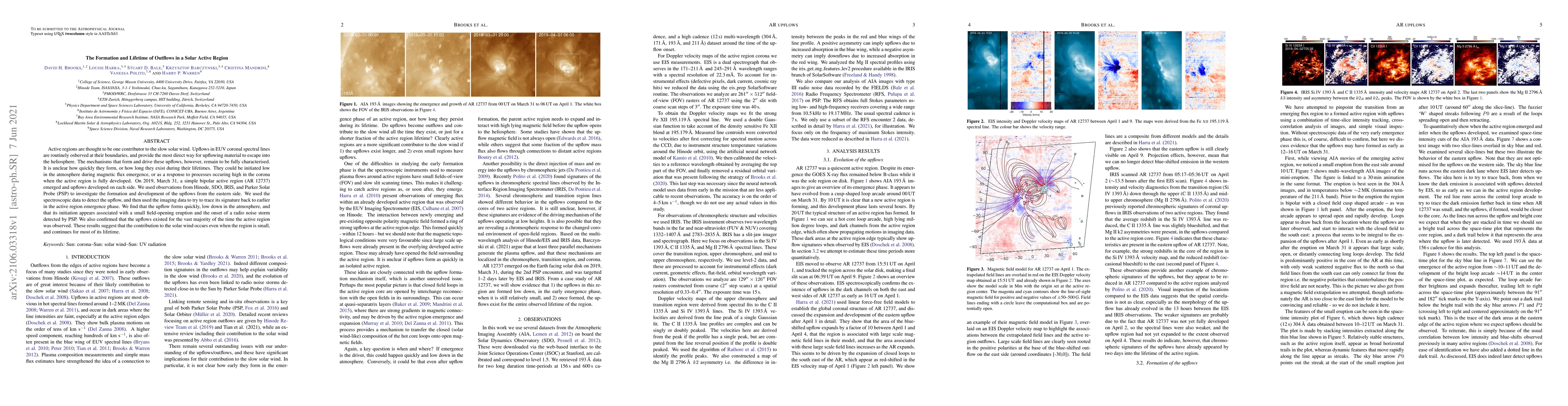 Active regions are thought to be one contributor to the slow solar wind. Upflows in EUV coronal spectral lines are routinely osberved at their boundaries, and provide the most direct way for upflowing material to escape into the heliosphere. The mechanisms that form and drive these upflows, however, remain to be fully characterised. It is unclear how quickly they form, or how long they exist during their lifetimes. They could be initiated low in the atmosphere during magnetic flux emergence, or as a response to processes occuring high in the corona when the active region is fully developed. On 2019, March 31, a simple bipolar active region (AR 12737) emerged and upflows developed on each side. We used observations from Hinode, SDO, IRIS, and Parker Solar Probe (PSP) to investigate the formation and development of the upflows from the eastern side. We used the spectroscopic data to detect the upflow, and then used the imaging data to try to trace its signature back to earlier in the active region emergence phase. We find that the upflow forms quickly, low down in the atmosphere, and that its initiation appears associated with a small field-opening eruption and the onset of a radio noise storm detected by PSP. We also confirmed that the upflows existed for the vast majority of the time the active region was observed. These results suggest that the contribution to the solar wind occurs even when the region is small, and continues for most of its lifetime.