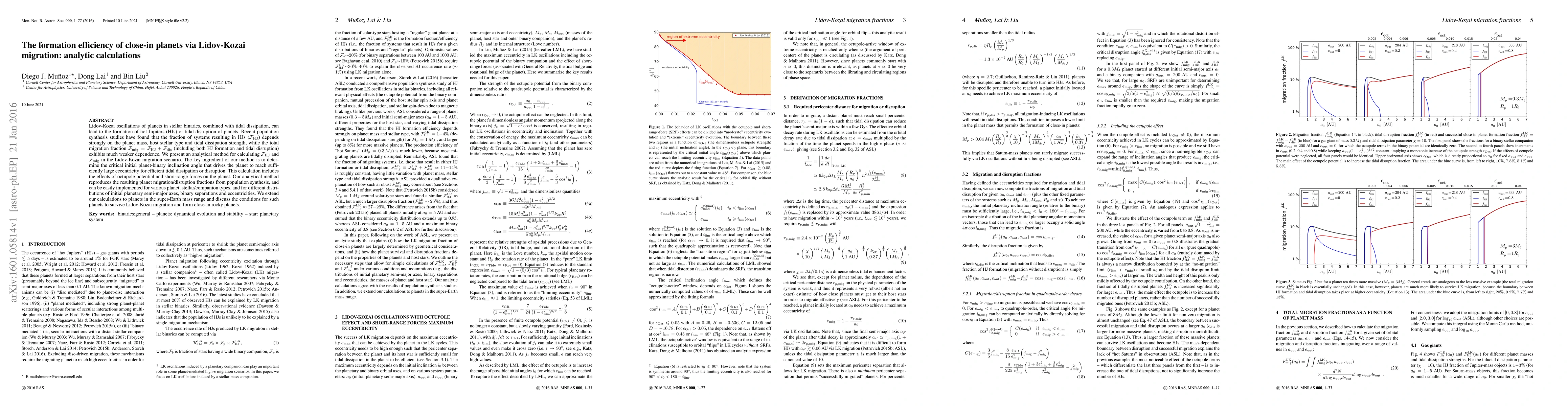 This paper presents an analytical method to calculate the formation efficiency of hot Jupiters via Lidov-Kozai migration, considering planet mass, stellar type, and tidal dissipation. The method determines the critical inclination angle for efficient tidal dissipation and disruption, reproducing results from population synthesis studies.