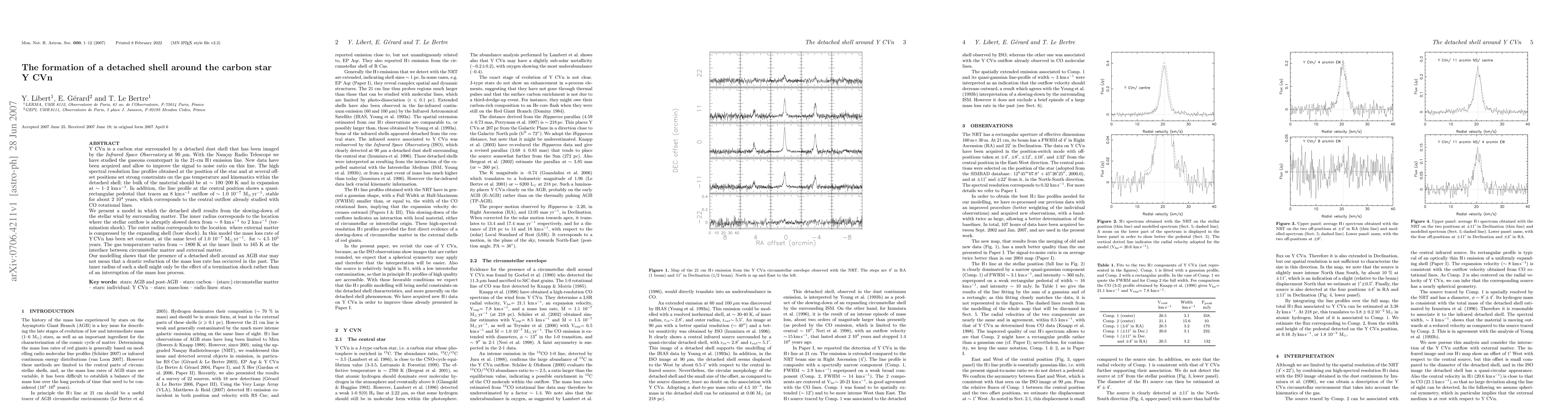 Y CVn is a carbon star surrounded by a detached dust shell that has been imaged by the Infrared Space Observatory at 90 microns. With the Nancay Radio Telescope we have studied the gaseous counterpart in the 21-cm HI emission line. New data have been acquired and allow to improve the signal to noise ratio on this line. The high spectral resolution line profiles obtained at the position of the star and at several offset positions set strong constraints on the gas temperature and kinematics within the detached shell; the bulk of the material should be at ~ 100-200 K and in expansion at ~ 1-2 km/s. In addition, the line profile at the central position shows a quasi-rectangular pedestal that traces an 8 km/s outflow of ~ 1.0 10^-7 Msol/yr, stable for about 2 10^4 years, which corresponds to the central outflow already studied with CO rotational lines. We present a model in which the detached shell results from the slowing-down of the stellar wind by surrounding matter. The inner radius corresponds to the location where the stellar outflow is abruptly slowed down from ~ 8 km/s to 2 km/s (termination shock). The outer radius corresponds to the location where external matter is compressed by the expanding shell (bow shock). In this model the mass loss rate of Y CVn has been set constant, at the same level of 1.0 10^-7 Msol/yr, for ~ 4.5 10^5 years. The gas temperature varies from ~ 1800 K at the inner limit to 165 K at the interface between circumstellar matter and external matter. Our modelling shows that the presence of a detached shell around an AGB star may not mean that a drastic reduction of the mass loss rate has occurred in the past. The inner radius of such a shell might only be the effect of a termination shock rather than of an interruption of the mass loss process.