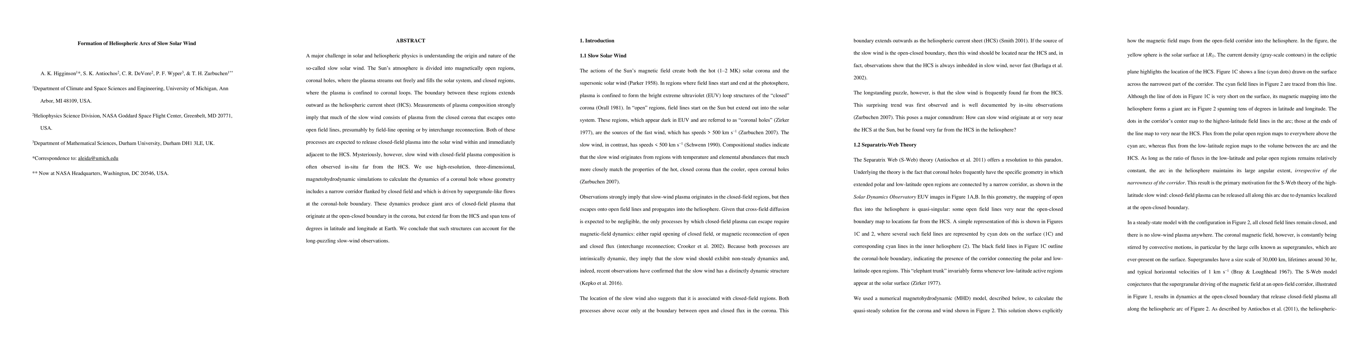This paper investigates the formation of heliospheric arcs of slow solar wind using high-resolution simulations, revealing that dynamic processes in coronal holes create giant arcs of closed-field plasma extending far from the heliospheric current sheet, explaining the origin of slow solar wind observed near Earth.