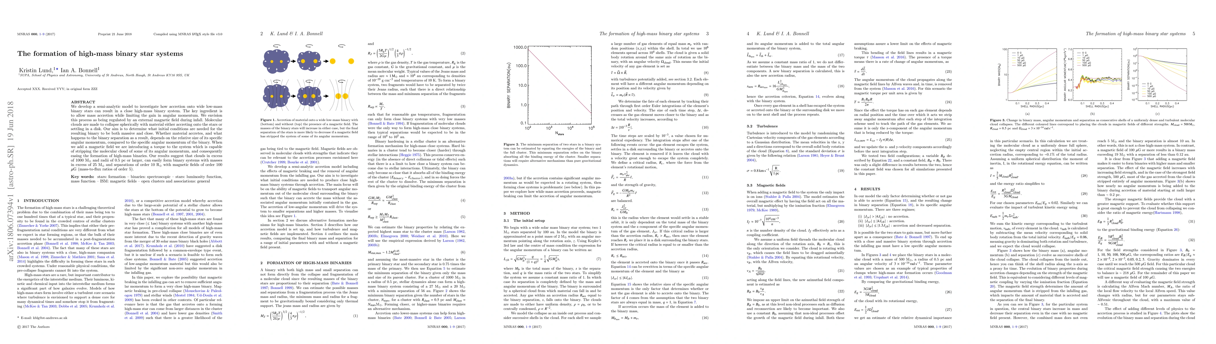 We develop a semi-analytic model to investigate how accretion onto wide low-mass binary stars can result in a close high-mass binary system. The key ingredient is to allow mass accretion while limiting the gain in angular momentum. We envision this process as being regulated by an external magnetic field during infall. Molecular clouds are made to collapse spherically with material either accreting onto the stars or settling in a disk. Our aim is to determine what initial conditions are needed for the resulting binary to be both massive and close. Whether material accretes, and what happens to the binary separation as a result, depends on the relative size of its specific angular momentum, compared to the specific angular momentum of the binary. When we add a magnetic field we are introducing a torque to the system which is capable of stripping the molecular cloud of some of its angular momentum, and consequently easing the formation of high-mass binaries. Our results suggest that clouds in excess of 1000 M$_\odot$ and radii of 0.5 pc or larger, can easily form binary systems with masses in excess of 25 M$_\odot$ and separations of order 10 R$_\odot$ with magnetic fields of order 100 {\mu}G (mass-to-flux ratios of order 5).