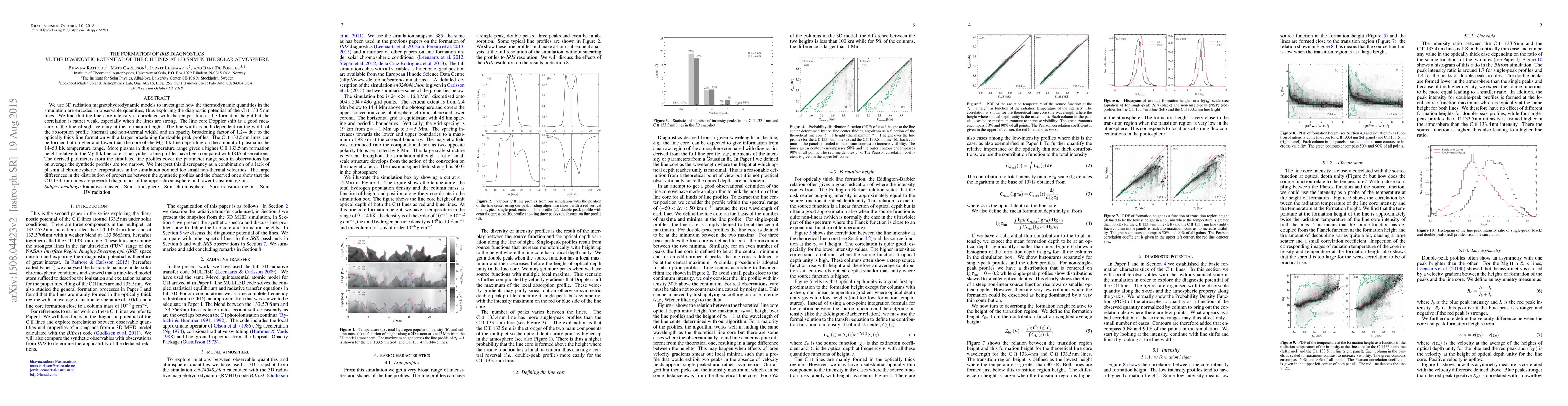 The 133.5 nm lines in the solar atmosphere have been found to be powerful diagnostics of the upper chromosphere and lower transition region, with correlations between line intensity and temperature, Doppler shift and velocity, and width and plasma properties.