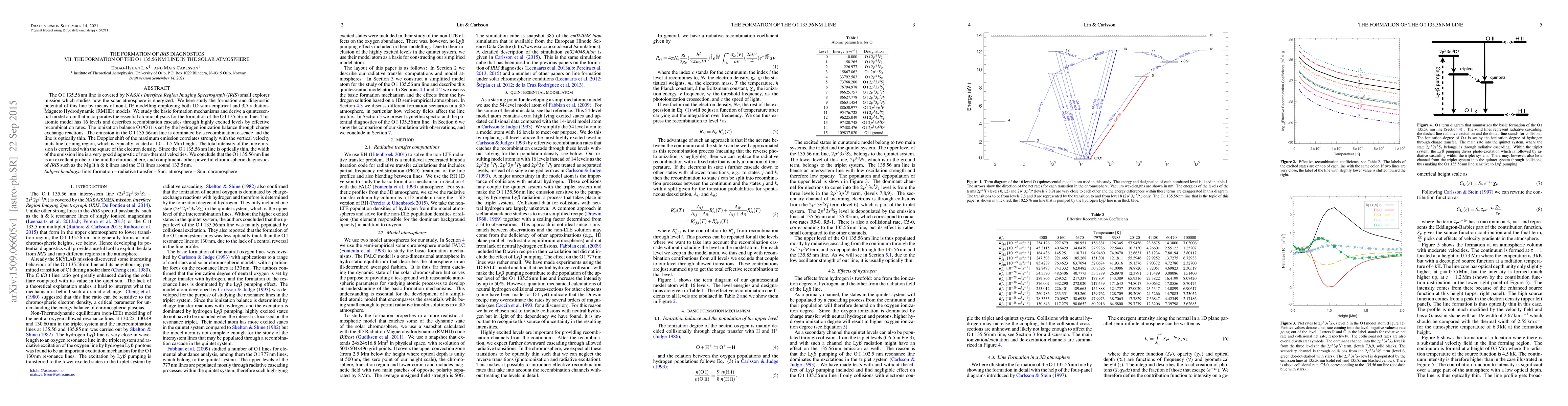 The O I 135.56 nm line is covered by NASA's Interface Region Imaging Spectrograph (IRIS) small explorer mission which studies how the solar atmosphere is energized. We here study the formation and diagnostic potential of this line by means of non-LTE modelling employing both 1D semi-empirical and 3D radiation-Magneto Hydrodynamic (RMHD) models. We study the basic formation mechanisms and derive a quintessential model atom that incorporates the essential atomic physics for the formation of the O I 135.56 nm line. This atomic model has 16 levels and describes recombination cascades through highly excited levels by effective recombination rates. The ionization balance O I/O II is set by the hydrogen ionization balance through charge exchange reactions. The emission in the O I 135.56 nm line is dominated by a recombination cascade and the line is optically thin. The Doppler shift of the maximum emission correlates strongly with the vertical velocity in its line forming region, which is typically located at 1.0 - 1.5 Mm height. The total intensity of the line emission is correlated with the square of the electron density. Since the O I 135.56 nm line is optically thin, the width of the emission line is a very good diagnostic of non-thermal velocities. We conclude that the O I 135.56 nm line is an excellent probe of the middle chromosphere, and compliments other powerful chromospheric diagnostics of IRIS such as the Mg II h & k lines and the C II lines around 133.5 nm.