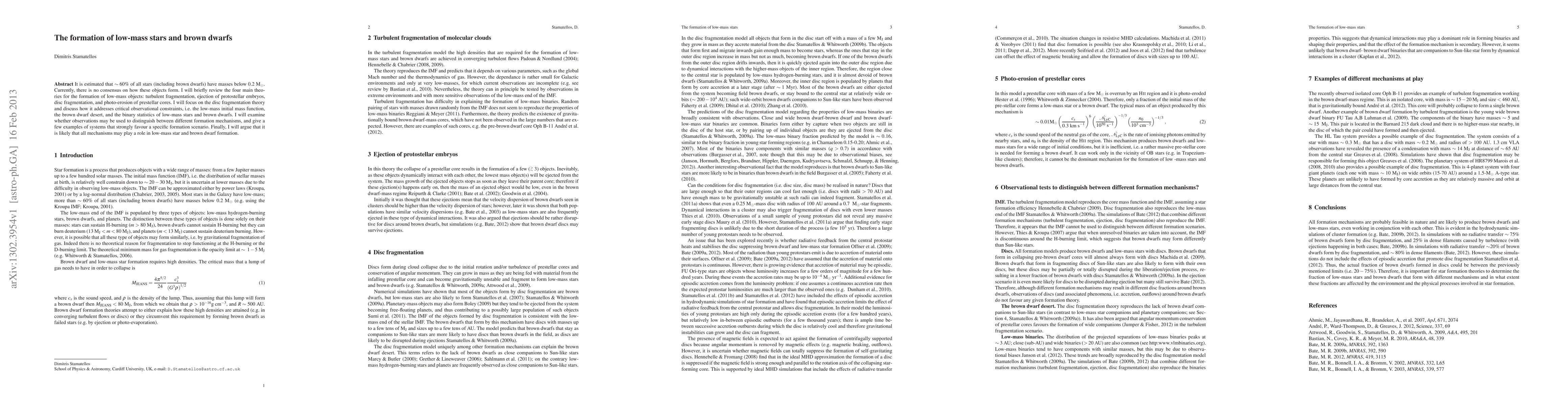 The paper reviews four main theories for the formation of low-mass stars and brown dwarfs: turbulent fragmentation, ejection of protostellar embryos, disc fragmentation, and photo-erosion of prestellar cores, focusing on disc fragmentation and its ability to address observational constraints.