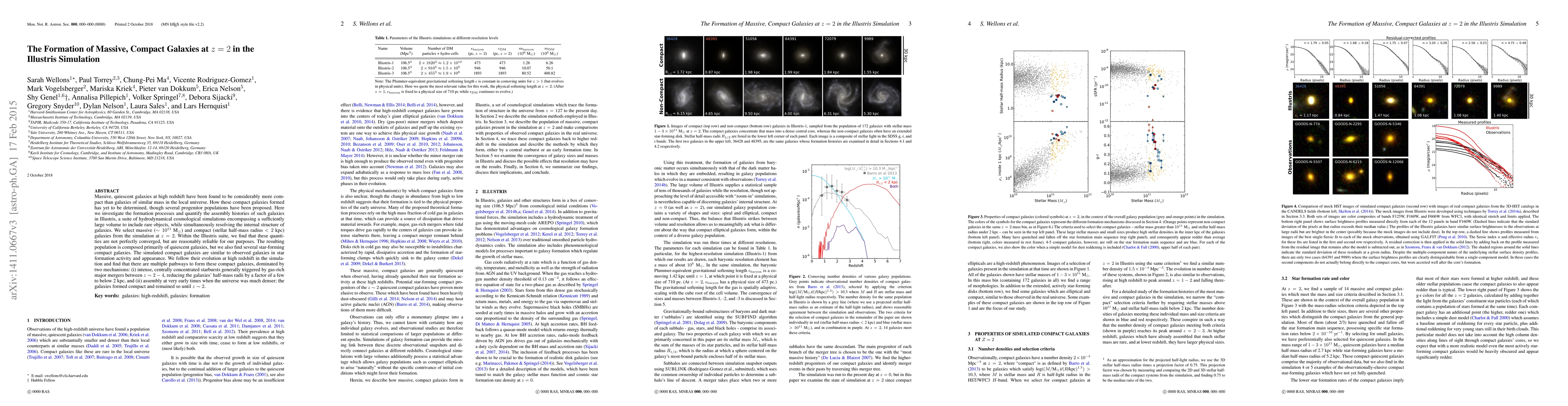 This paper investigates the formation of massive, compact galaxies at z=2 in the Illustris simulation, finding they primarily form through intense starbursts triggered by gas-rich major mergers or early assembly in a denser universe. The simulation reveals multiple pathways to their compact structure, resembling observed galaxies.