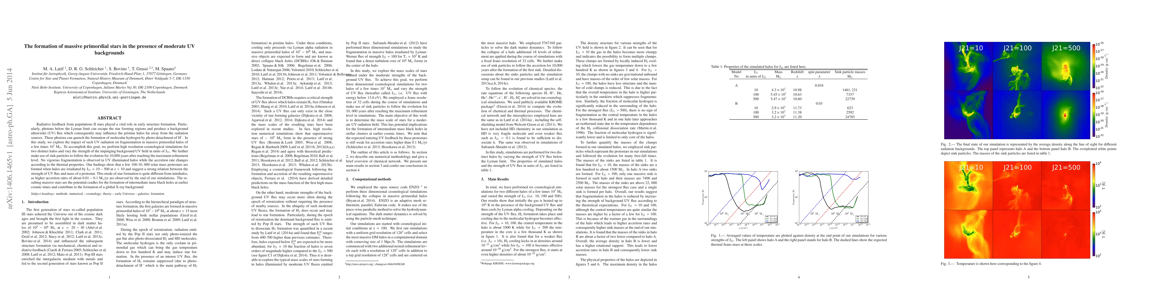This study investigates how moderate UV backgrounds from early Population II stars influence the formation of massive primordial stars in halos of around $10^7$ M$_\odot$. The simulations reveal that UV radiation suppresses fragmentation, leading to the formation of protostars with masses ranging from 100 to 10,000 solar masses, depending on the UV flux strength, with higher accretion rates observed compared to minihalos.