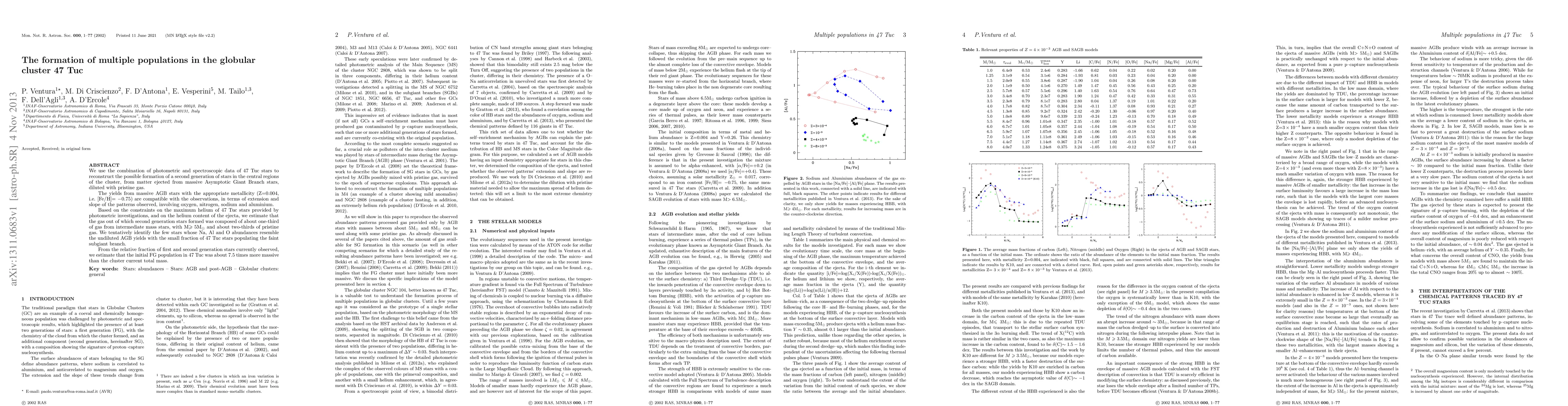 This paper investigates the formation of a second stellar generation in the globular cluster 47 Tuc, suggesting it formed from ejected material from massive Asymptotic Giant Branch stars mixed with pristine gas. The study estimates that the second generation stars' gas was composed of one-third from intermediate mass stars and two-thirds from pristine gas.