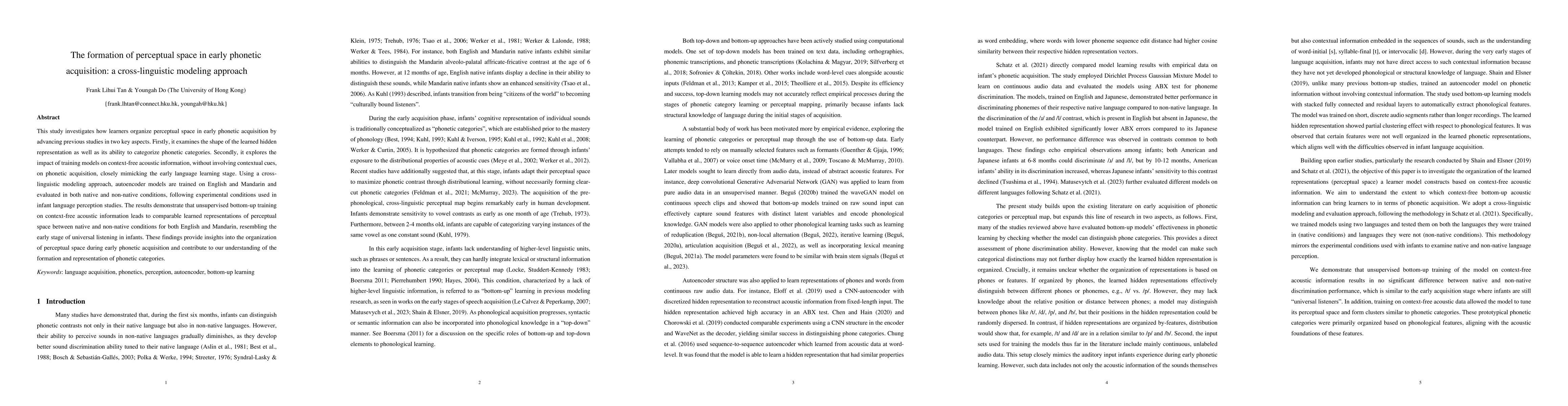 This study investigates how learners organize perceptual space in early phonetic acquisition by advancing previous studies in two key aspects. Firstly, it examines the shape of the learned hidden representation as well as its ability to categorize phonetic categories. Secondly, it explores the impact of training models on context-free acoustic information, without involving contextual cues, on phonetic acquisition, closely mimicking the early language learning stage. Using a cross-linguistic modeling approach, autoencoder models are trained on English and Mandarin and evaluated in both native and non-native conditions, following experimental conditions used in infant language perception studies. The results demonstrate that unsupervised bottom-up training on context-free acoustic information leads to comparable learned representations of perceptual space between native and non-native conditions for both English and Mandarin, resembling the early stage of universal listening in infants. These findings provide insights into the organization of perceptual space during early phonetic acquisition and contribute to our understanding of the formation and representation of phonetic categories.