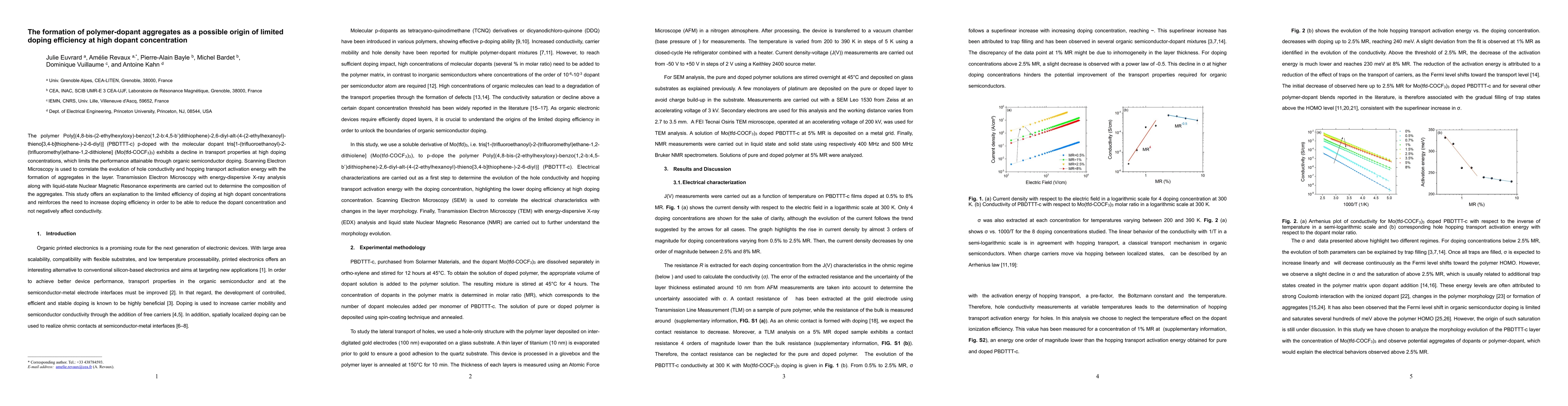 This research investigates polymer (PBDTTT-c) doped with Mo(tfd-COCF3)3, finding that high dopant concentrations lead to aggregate formation, limiting doping efficiency and transport properties. Advanced microscopy and NMR techniques reveal the nature of these aggregates, providing insight into improving doping efficiency for better organic semiconductor performance.
