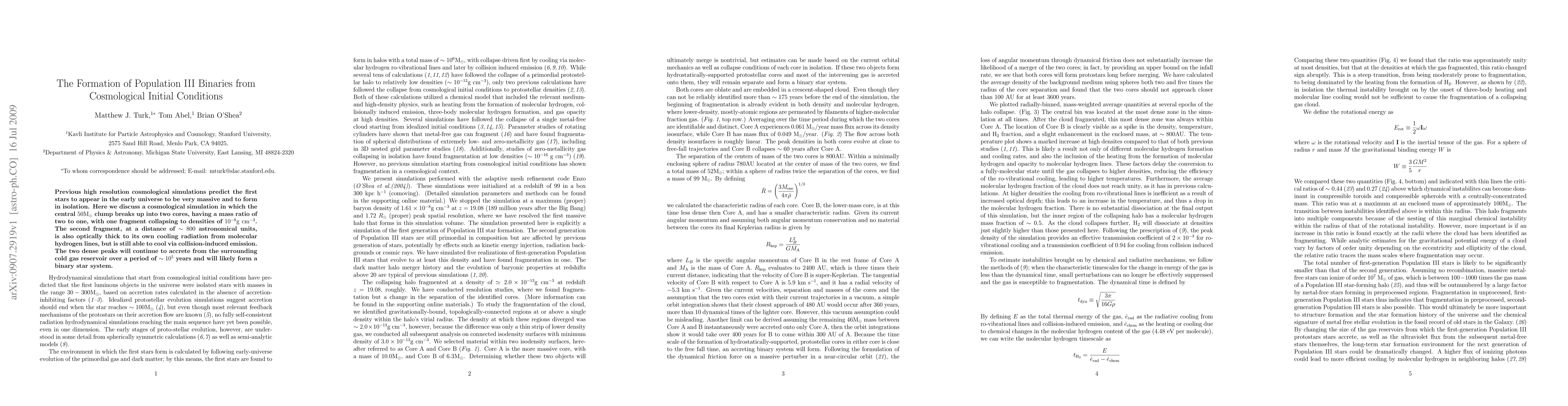 Previous high resolution cosmological simulations predict the first stars to appear in the early universe to be very massive and to form in isolation. Here we discuss a cosmological simulation in which the central 50 solar mass clump breaks up into two cores, having a mass ratio of two to one, with one fragment collapsing to densities of 10^{-8} g/cc. The second fragment, at a distance of 800 astronomical units, is also optically thick to its own cooling radiation from molecular hydrogen lines, but is still able to cool via collision-induced emission. The two dense peaks will continue to accrete from the surrounding cold gas reservoir over a period of 10^5 years and will likely form a binary star system.