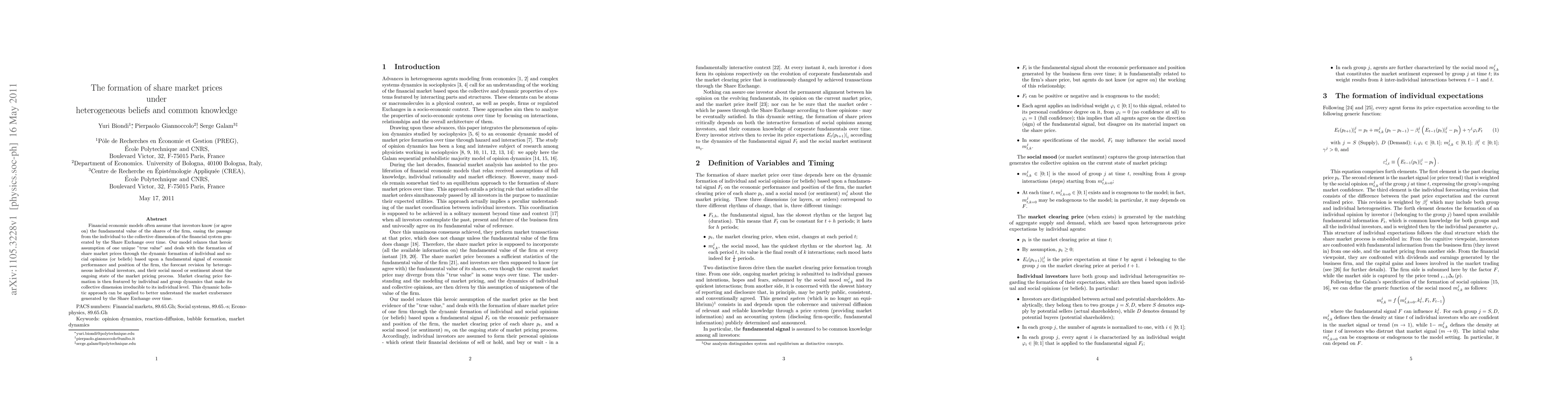 Financial economic models often assume that investors know (or agree on) the fundamental value of the shares of the firm, easing the passage from the individual to the collective dimension of the financial system generated by the Share Exchange over time. Our model relaxes that heroic assumption of one unique "true value" and deals with the formation of share market prices through the dynamic formation of individual and social opinions (or beliefs) based upon a fundamental signal of economic performance and position of the firm, the forecast revision by heterogeneous individual investors, and their social mood or sentiment about the ongoing state of the market pricing process. Market clearing price formation is then featured by individual and group dynamics that make its collective dimension irreducible to its individual level. This dynamic holistic approach can be applied to better understand the market exuberance generated by the Share Exchange over time.