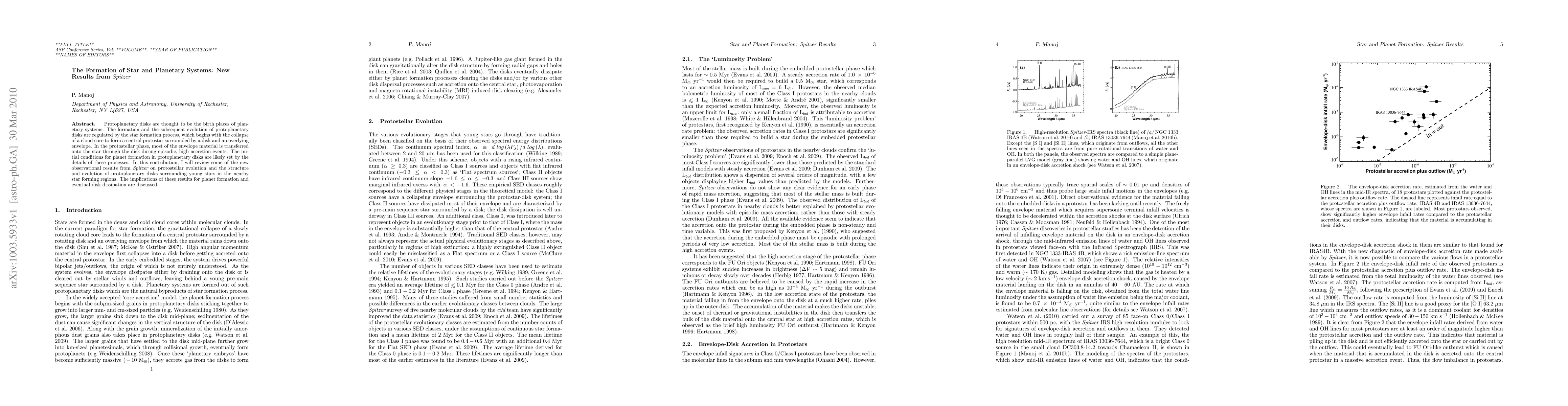 This paper reviews new Spitzer observations detailing the formation and evolution of protoplanetary disks, emphasizing the role of episodic high accretion events in shaping the initial conditions for planet formation and the eventual dissipation of these disks. The findings provide insights into the processes governing star and planetary system formation.