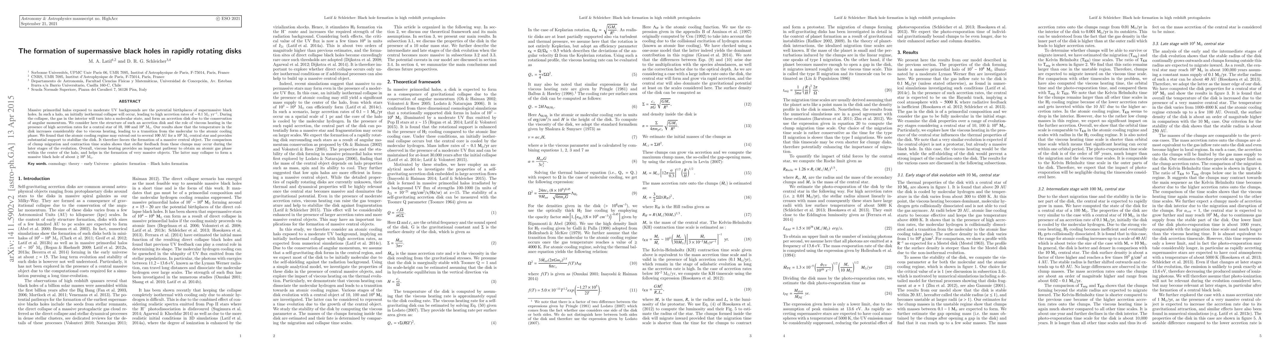 Massive primordial halos exposed to moderate UV backgrounds are the potential birthplaces of supermassive black holes. In such a halo, an initially isothermal collapse will occur, leading to high accretion rates of $\sim0.1$~M$_\odot$~yr$^{-1}$. During the collapse, the gas in the interior will turn into a molecular state, and form an accretion disk due to the conservation of angular momentum. We consider here the structure of such an accretion disk and the role of viscous heating in the presence of high accretion rates for a central star of $10$, $100$ and $10^4$~M$_\odot$. Our results show that the temperature in the disk increases considerably due to viscous heating, leading to a transition from the molecular to the atomic cooling phase. We found that the atomic cooling regime may extend out to several $100$~AU for a $10^4$~M$_\odot$ central star and provides substantial support to stabilize the disk. It therefore favors the formation of a massive central object. The comparison of clump migration and contraction time scales shows that stellar feedback from these clumps may occur during the later stages of the evolution. Overall, viscous heating provides an important pathway to obtain an atomic gas phase within the center of the halo, and helps in the formation of very massive objects. The latter may collapse to form a massive black hole of about $\geq 10^4$~M$_\odot$.