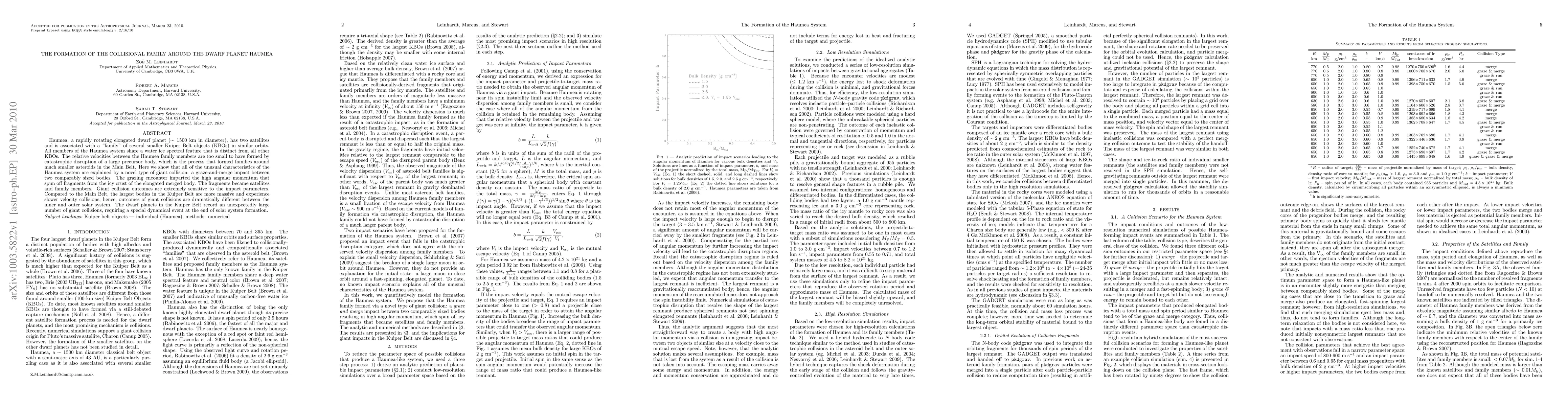 This paper proposes that the Haumea family of Kuiper Belt objects formed through a unique giant collision—a graze-and-merge impact between two large bodies, which explains the system's distinct spectral features and the low relative velocities among its members. This contrasts with typical catastrophic disruption events seen in the Main Belt.
