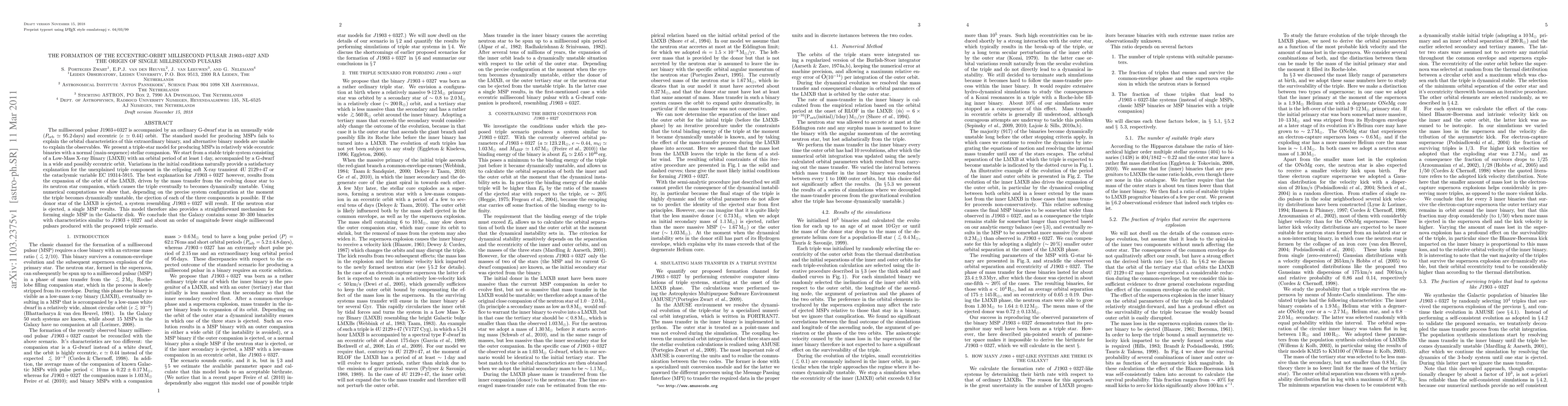 The millisecond pulsar J1903+0327 is accompanied by an ordinary G-dwarf star in an unusually wide ($P_{\rm orb} \simeq 95.2$\,days) and eccentric ($e \simeq 0.44$) orbit. The standard model for producing MSPs fails to explain the orbital characteristics of this extraordinary binary, and alternative binary models are unable to explain the observables. We present a triple-star model for producing MSPs in relatively wide eccentric binaries with a normal (main-sequence) stellar companion. We start from a stable triple system consisting of a Low-Mass X-ray Binary (LMXB) with an orbital period of at least 1 day, accompanied by a G-dwarf in a wide and possibly eccentric orbit. Variations in the initial conditions naturally provide a satisfactory explanation for the unexplained triple component in the eclipsing soft X-ray transient 4U~2129+47 or the cataclysmic variable EC 19314-5915. The best explanation for J1903, however, results from the expansion of the orbit of the LMXB, driven by the mass transfer from the evolving donor star to its neutron star companion, which causes the triple eventually to becomes dynamically unstable. Using numerical computations we show that, depending on the precise system configuration at the moment the triple becomes dynamically unstable, the ejection of each of the three components is possible. If the donor star of the LMXB is ejected, a system resembling J1903, will result. If the neutron star is ejected, a single MSP results. This model therefore also provides a straightforward mechanism for forming single MSP in the Galactic disk. We conclude that the Galaxy contains some 30--300 binaries with characteristics similar to J1903, and about an order of magnitude fewer single millisecond pulsars produced with the proposed triple scenario.