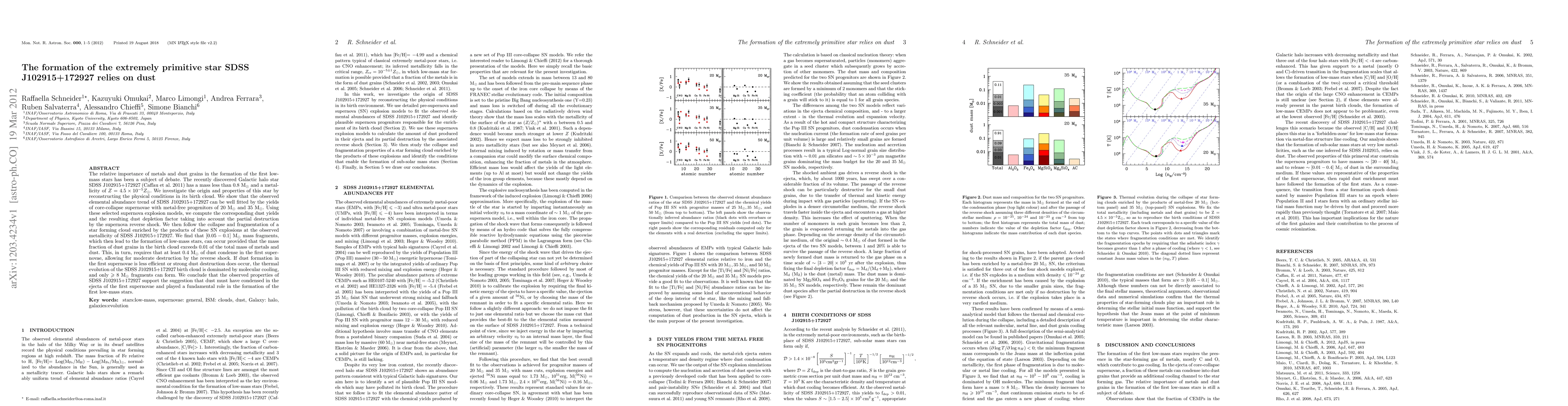 The relative importance of metals and dust grains in the formation of the first low-mass stars has been a subject of debate. The recently discovered Galactic halo star SDSS J102915+172927 (Caffau et al. 2011) has a mass less than 0.8 Msun and a metallicity of Z = 4.5 10^{-5} Zsun. We investigate the origin and properties of this star by reconstructing the physical conditions in its birth cloud. We show that the observed elemental abundance trend of SDSS J102915+172927 can be well fitted by the yields of core-collapse supernovae with metal-free progenitors of 20 Msun and 35 Msun. Using these selected supernova explosion models, we compute the corresponding dust yields and the resulting dust depletion factor taking into account the partial destruction by the supernova reverse shock. We then follow the collapse and fragmentation of a star forming cloud enriched by the products of these SN explosions at the observed metallicity of SDSS J102915+172927. We find that [0.05 - 0.1] Msun mass fragments, which then lead to the formation of low-mass stars, can occur provided that the mass fraction of dust grains in the birth cloud exceeds 0.01 of the total mass of metals and dust. This, in turn, requires that at least 0.4 Msun of dust condense in the first supernovae, allowing for moderate destruction by the reverse shock. If dust formation in the first supernovae is less efficient or strong dust destruction does occur, the thermal evolution of the SDSS J102915+172927 birth cloud is dominated by molecular cooling, and only > 8 Msun fragments can form. We conclude that the observed properties of SDSS J102915+172927 support the suggestion that dust must have condensed in the ejecta of the first supernovae and played a fundamental role in the formation of the first low-mass stars.
