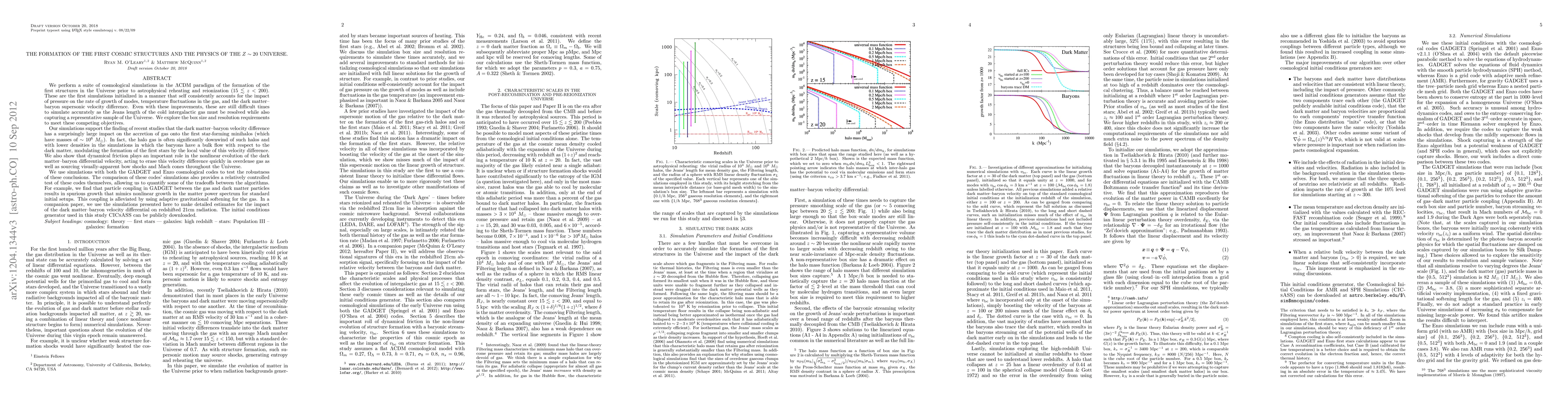 We perform a suite of cosmological simulations in the LCDM paradigm of the formation of the first structures in the Universe prior to astrophysical reheating and reionization (15<~z<200). These are the first simulations initialized in a manner that self consistently account for the impact of pressure on the rate of growth of modes, temperature fluctuations in the gas, and the dark matter-baryon supersonic velocity difference. Even with these improvements, these are still difficult times to simulate accurately as the Jeans length of the cold intergalactic gas must be resolved while also capturing a representative sample of the Universe. Our simulations support the finding of recent studies that the dark matter-baryon velocity difference has a surprisingly large impact on the accretion of gas onto the first star-forming minihalos (with masses of ~10^6 Msun). In fact, the halo gas is often significantly downwind of such halos and with lower densities, which delays the formation of the first stars in most locations in the Universe. We also show that dynamical friction plays an important role in the nonlinear evolution of the differential velocity, acting to erase this velocity difference quickly in overdense gas as well as sourcing visually-apparent bow shocks and Mach cones throughout the Universe. We use simulations with both the GADGET and Enzo cosmological codes to test the robustness of these conclusions. We find that particle coupling in GADGET between the gas and dark matter particles can result in spurious growth that mimics nonlinear growth in the matter power spectrum. In a companion paper, we use the simulations presented here to make detailed estimates for the impact of the dark matter--baryon velocity differential on redshifted 21cm radiation. The initial conditions generator used in this study CICsASS can be publicly downloaded.