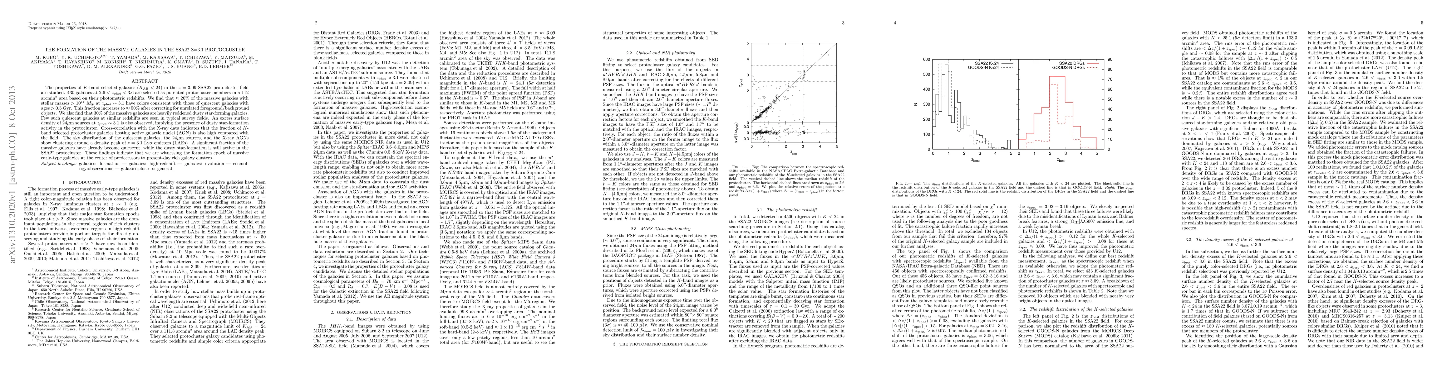 This study investigates the properties of galaxies in the SSA22 z=3.1 protocluster, finding that 20% of massive galaxies exhibit quiescent characteristics, rising to 50% after corrections. Additionally, 30% are dusty star-forming galaxies, indicating active star formation and a high fraction of AGN hosting galaxies, suggesting the formation of early-type galaxies in the protocluster's core.