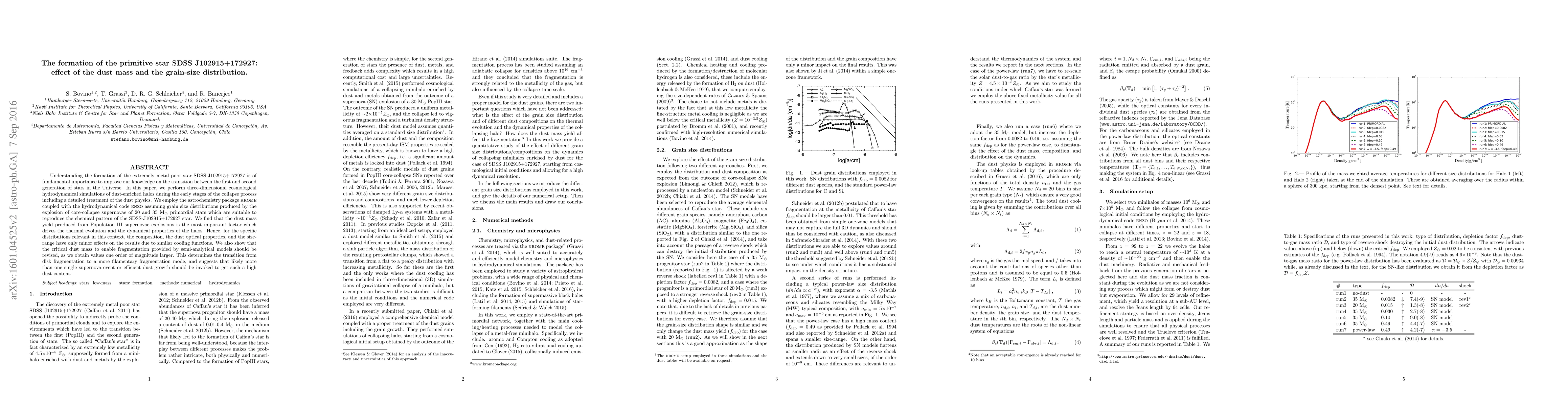 This research uses 3D cosmological simulations to study the formation of the primitive star SDSS J102915+172927, focusing on dust mass and grain-size distribution. Key findings indicate that dust mass from Population III supernovae significantly impacts halo thermal evolution and dynamics, while grain composition, properties, and size-range have minimal effects. The study suggests revising the critical dust mass for fragmentation, implying a transition from disk to filamentary fragmentation, and proposing multiple supernova events or efficient dust growth to explain high dust content.