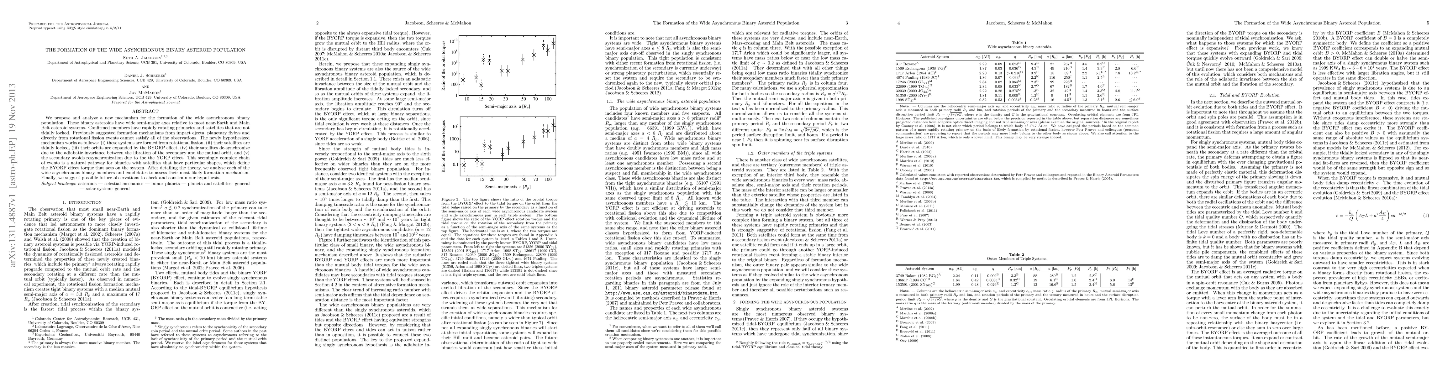 The paper proposes a new formation mechanism for wide asynchronous binary asteroids, involving rotational fission, tidal locking, orbit expansion by the Yarkovsky-O'Keefe-Radzievskii-Paddack (BYORP) effect, de-synchronization of satellites, and prevention of resynchronization by the YORP effect. The hypothesis is tested against known and candidate binaries, with suggested future observations for validation.