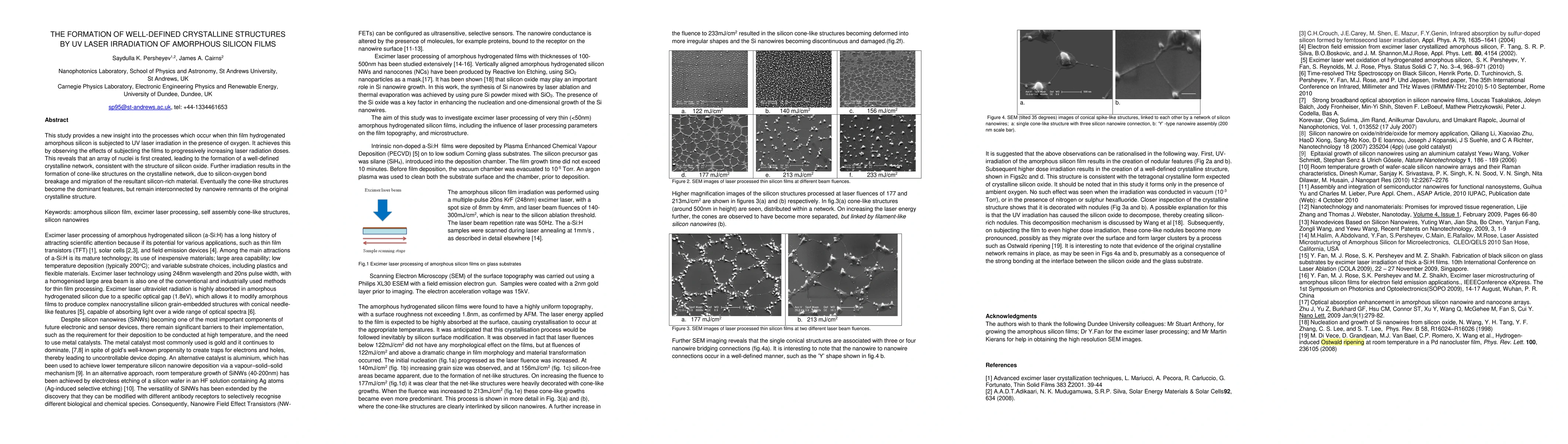 The study demonstrates the formation of well-defined crystalline structures by UV laser irradiation of amorphous silicon films in the presence of oxygen.