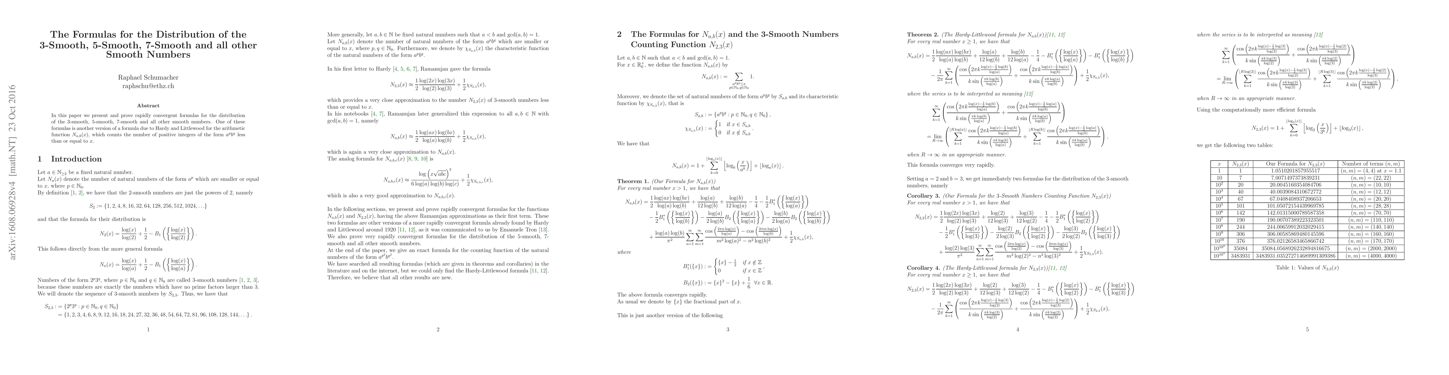 In this paper we present and prove rapidly convergent formulas for the distribution of the $3$-smooth, $5$-smooth, $7$-smooth and all other smooth numbers. One of these formulas is another version of a formula due to Hardy and Littlewood for the arithmetic function $N_{a,b}(x)$, which counts the number of positive integers of the form $a^{p}b^{q}$ less than or equal to $x$.