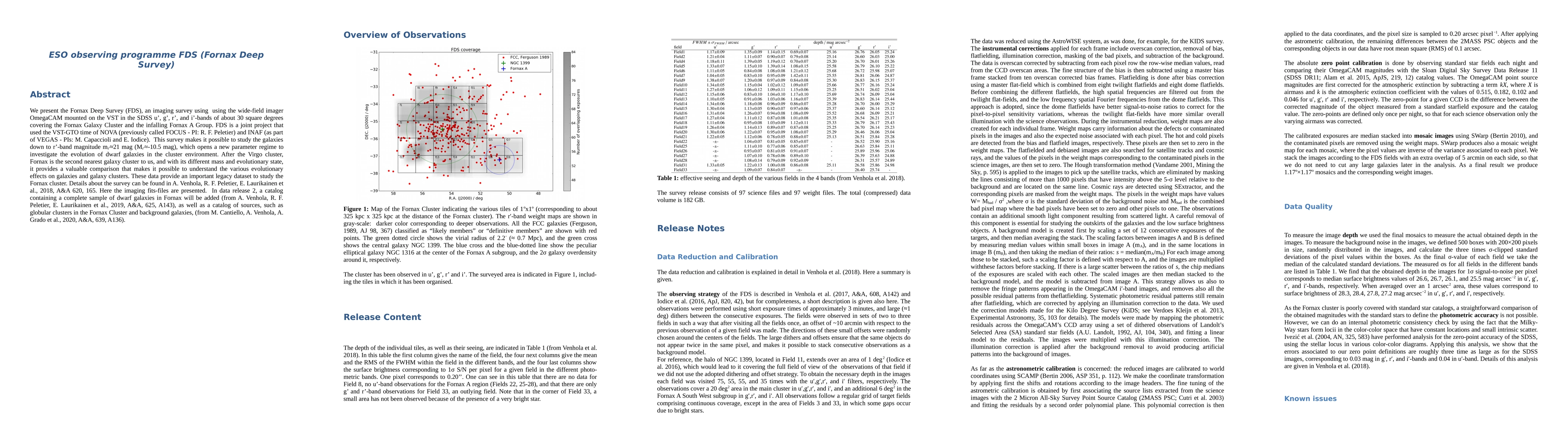 The Fornax Deep Survey (FDS) presents its first data release, featuring imaging data from OmegaCAM on the VST in SDSS bands, covering the Fornax Galaxy Cluster and the Fornax A Group. The survey provides a legacy dataset for studying galaxy properties influenced by the cluster environment.