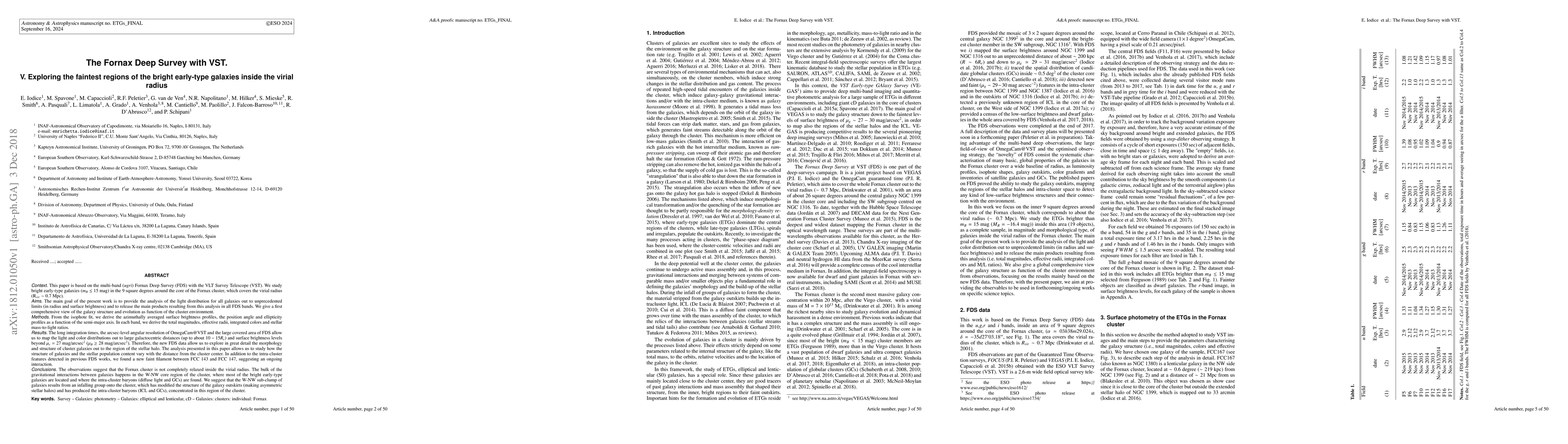 This paper is based on the multi-band (ugri) Fornax Deep Survey (FDS) with the VLT Survey Telescope (VST). We study bright early-type galaxies (m_B<15 mag) in the 9 square degrees around the core of the Fornax cluster, which covers the virial radius. The main goal of the present work is to provide the analysis of the light distribution for all galaxies out to unprecedented limits (in radius and surface brightness) and to release the main products resulting from this analysis in all FDS bands. From the isophote fit, we derive the azimuthally averaged surface brightness profiles, the position angle and ellipticity profiles as a function of the semi-major axis. In each band, we derive the total magnitudes, effective radii, integrated colors and stellar mass-to-light ratios. The long integration times, the arcsec-level angular resolution of OmegaCam@VST and the large covered area of FDS allow us to map the light and color distributions out to large galactocentric distances (up to about 10-15 R_e) and surface brightness levels beyond mu_r = 27 mag/arcsec^2 (mu_B > 28 mag/arcsec^2). Therefore, the new FDS data allow us to explore in great detail the morphology and structure of cluster galaxies out to the region of the stellar halo. The observations suggest that the Fornax cluster is not completely relaxed inside the virial radius. The bulk of the gravitational interactions between galaxies happens in the W-NW core region of the cluster, where most of the bright early-type galaxies are located and where the intra-cluster baryons (diffuse light and GCs) are found. We suggest that the W-NW sub-clump of galaxies results from an infalling group onto the cluster, which has modified the structure of the galaxy outskirts (making asymmetric stellar halos) and has produced the intra-cluster baryons (ICL and GCs), concentrated in this region of the cluster.
