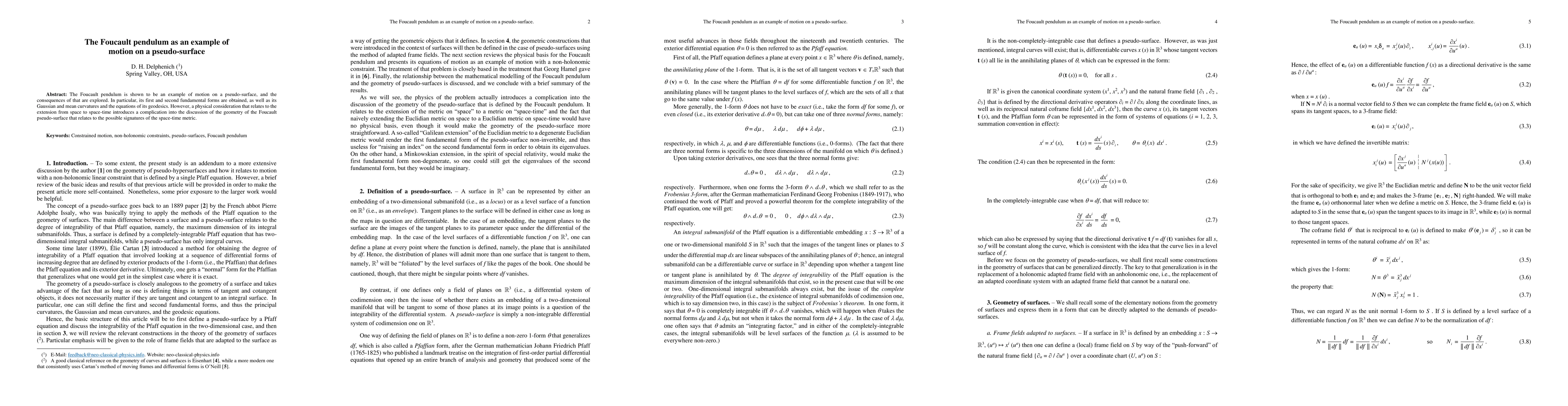 The Foucault pendulum demonstrates motion on a pseudo-surface, with its first and second fundamental forms, Gaussian and mean curvatures, and geodesic equations derived. The study introduces a complication regarding the space-time metric's signature due to physical considerations extending from space to space-time.