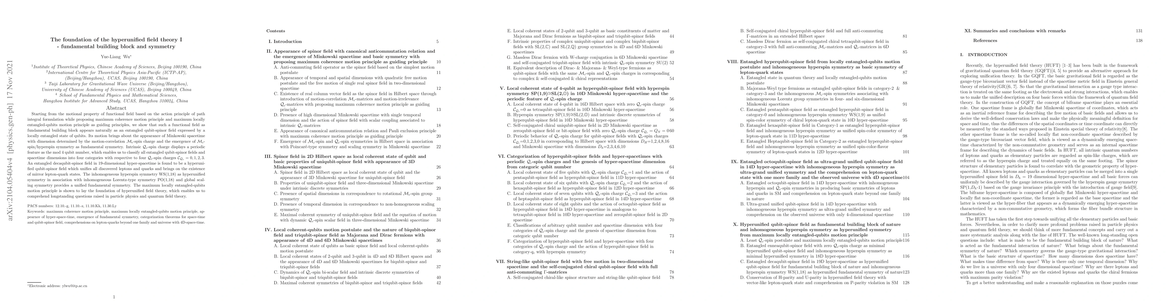 Starting from the motional property of functional field based on the action principle of path integral formulation while proposing maximum coherence motion principle and maximum locally entangled-qubits motion principle as guiding principles, we show that such a functional field as fundamental building block appears naturally as an entangled qubit-spinor field expressed by a locally entangled state of qubits. Its motion brings about the appearance of Minkowski spacetime with dimension determined by the motion-correlation $\cM_c$-spin charge and the emergence of $\cM_c$-spin/hyperspin symmetry as fundamental symmetry. Intrinsic $\cQ_c$-spin charge displays a periodic feature as the mod 4 qubit number, which enables us to classify all entangled qubit-spinor fields and spacetime dimensions into four categories with respective to four $\cQ_c$-spin charges $\cC_{\cQ_c}=0,1,2,3$. An entangled decaqubit-spinor field in 19-dimensional hyper-spacetime is found to be a hyperunified qubit-spinor field which unifies all discovered leptons and quarks and brings on the existence of mirror lepton-quark states. The inhomogeneous hyperspin symmetry WS(1,18) as hyperunified symmetry in association with inhomogeneous Lorentz-type symmetry PO(1,18) and global scaling symmetry provides a unified fundamental symmetry. The maximum locally entangled-qubits motion principle is shown to lay the foundation of hyperunified field theory, which enables us to comprehend longstanding questions raised in particle physics and quantum field theory.