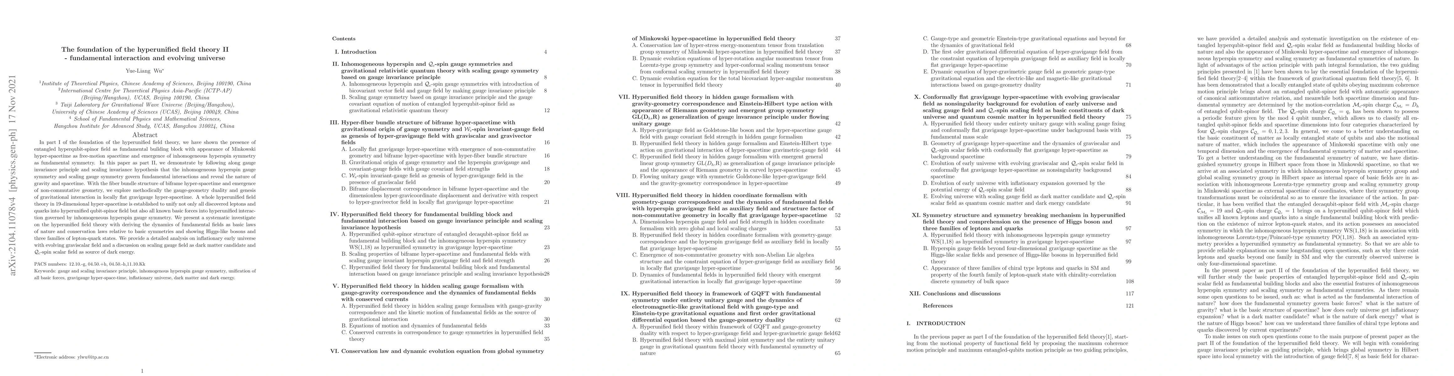 In part I of the foundation of the hyperunified field theory, we have shown the presence of entangled hyperqubit-spinor field as fundamental building block with appearance of Minkowski hyper-spacetime as free-motion spacetime and emergence of inhomogeneous hyperspin symmetry as fundamental symmetry. In this paper as part II, we demonstrate by following along gauge invariance principle and scaling invariance hypothesis that the inhomogeneous hyperspin gauge symmetry and scaling gauge symmetry govern fundamental interactions and reveal the nature of gravity and spacetime. With the fiber bundle structure of biframe hyper-spacetime and emergence of non-commutative geometry, we explore methodically the gauge-geometry duality and genesis of gravitational interaction in locally flat gravigauge hyper-spacetime. A whole hyperunified field theory in 19-dimensional hyper-spacetime is established to unify not only all discovered leptons and quarks into hyperunified qubit-spinor field but also all known basic forces into hyperunified interaction governed by inhomogeneous hyperspin gauge symmetry. We present a systematic investigate on the hyperunified field theory with deriving the dynamics of fundamental fields as basic laws of nature and conservation laws relative to basic symmetries and showing Higgs-like bosons and three families of lepton-quark states. We provide a detailed analysis on inflationary early universe with evolving graviscalar field and a discussion on scaling gauge field as dark matter candidate and $\cQ_c$-spin scalar field as source of dark energy.