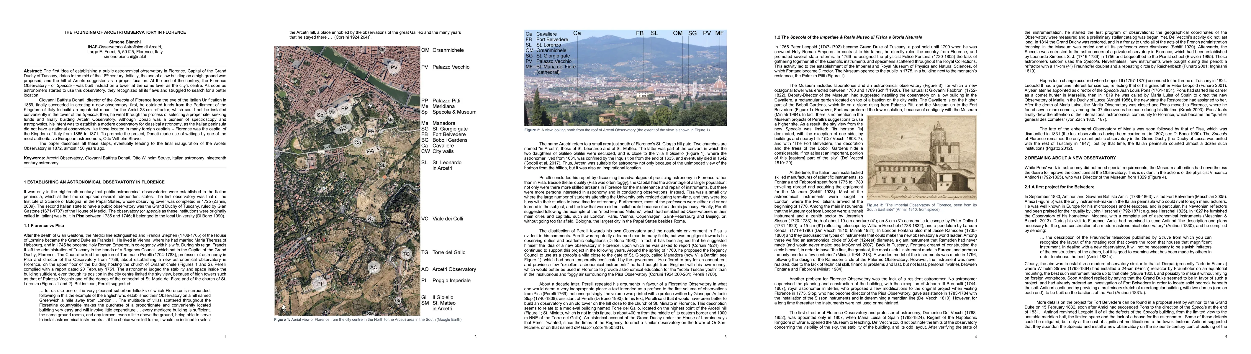 The first idea of establishing a public astronomical observatory in Florence, Capital of the Grand Duchy of Tuscany, dates to the mid of the 18th century. Initially, the use of a low building on a high ground was proposed, and the hill of Arcetri suggested as a proper location. At the end of the century, the Florence Observatory - or Specola - was built instead on a tower at the same level as the city's centre. As soon as astronomers started to use this observatory, they recognized all its flaws and struggled to search for a better location. Giovanni Battista Donati, director of the Specola of Florence from the eve of the Italian Unification in 1859, finally succeeded in creating a new observatory: first, he obtained funds from the Parliament of the Kingdom of Italy to build an equatorial mount for the Amici 28-cm refractor, which could not be installed conveniently in the tower of the Specola; then, he went through the process of selecting a proper site, seeking funds and finally building Arcetri Observatory. Although Donati was a pioneer of spectroscopy and astrophysics, his intent was to establish a modern observatory for classical astronomy, as the Italian peninsula did not have a national observatory like those located in many foreign capitals - Florence was the capital of the Kingdom of Italy from 1865 to 1871. To promote the project, Donati made use of writings by one of the most authoritative European astronomers, Otto Wilhelm Struve. The paper describes all these steps, eventually leading to the final inauguration of the Arcetri Observatory in 1872, almost 150 years ago.