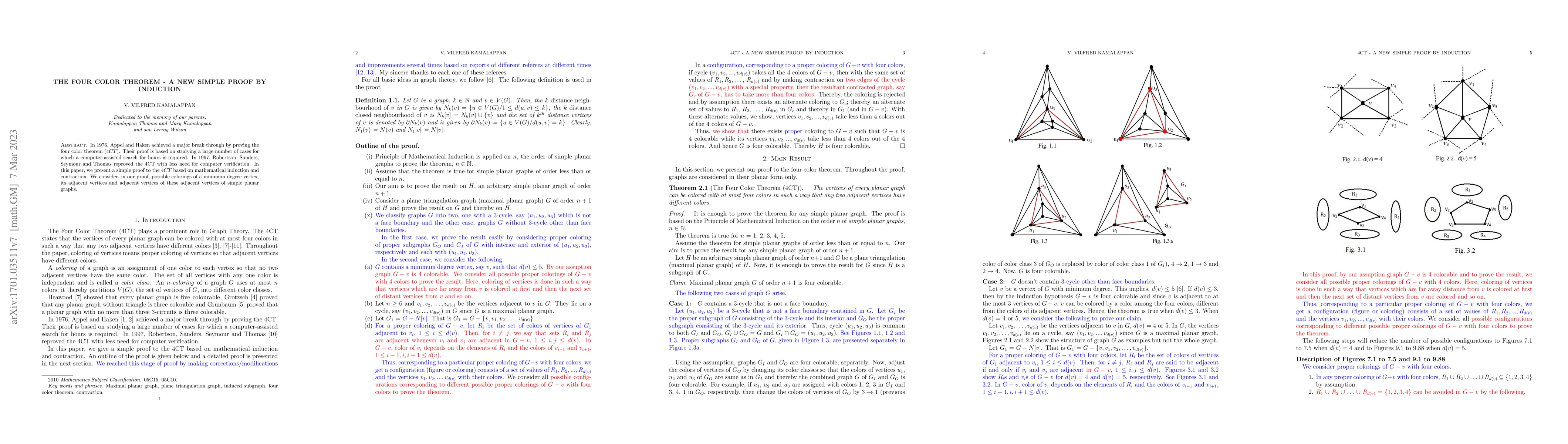 In 1976, Appel and Haken achieved a major break through by proving the four color theorem $(4CT)$. Their proof is based on studying a large number of cases for which a computer-assisted search for hours is required. In 1997, Robertson, Sanders, Seymour and Thomas reproved the 4CT with less need for computer verification. In this paper, we present a simple proof to the $4CT$ based on mathematical induction and contraction. We consider, in our proof, possible colorings of a minimum degree vertex, its adjacent vertices and adjacent vertices of these adjacent vertices of simple planar graphs.