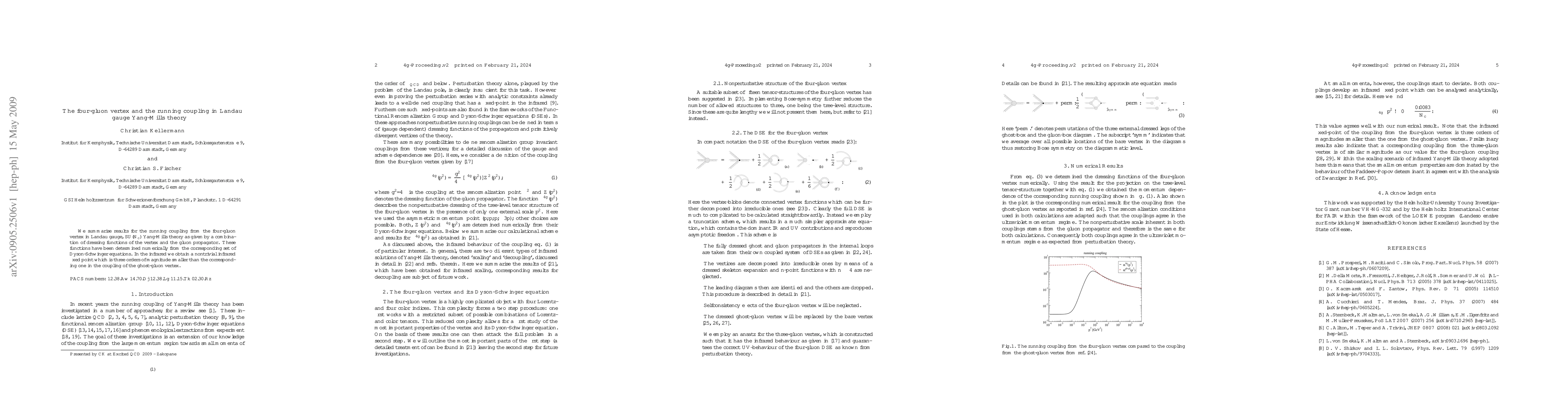 We summarise results for the running coupling from the four-gluon vertex in Landau gauge, SU($N_c$) Yang-Mills theory as given by a combination of dressing functions of the vertex and the gluon propagator. These functions have been determined numerically from the corresponding set of Dyson-Schwinger equations. In the infrared we obtain a nontrivial infrared fixed point which is three orders of magnitude smaller than the corresponding one in the coupling of the ghost-gluon vertex.