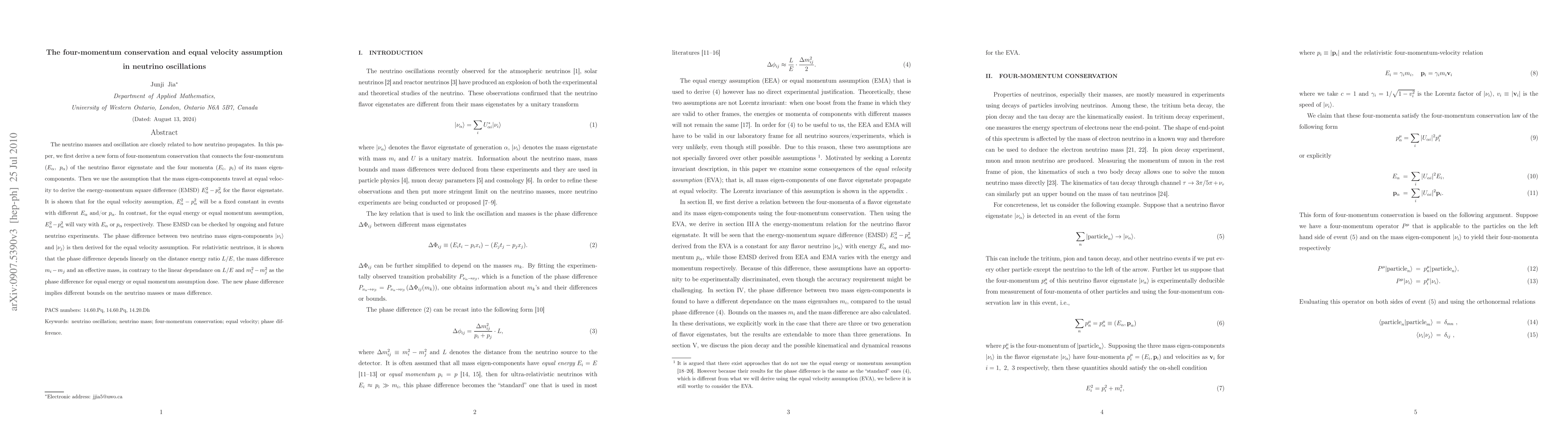 The neutrino masses and oscillation are closely related to how neutrino propagates. In this paper, we first derive a new form of four-momentum conservation that connects the four-momentum $(E_{\alpha},~p_{\alpha})$ of the neutrino flavor eigenstate and the four momenta $(E_i,~p_i)$ of its mass eigen-components. Then we use the assumption that the mass eigen-components travel at equal velocity to derive the energy-momentum square difference (EMSD) $E_{\alpha}^2-p_{\alpha}^2$ for the flavor eigenstate. It is shown that for the equal velocity assumption, $E_{\alpha}^2-p_{\alpha}^2$ will be a fixed constant in events with different $E_{\alpha}$ and/or $p_{\alpha}$. In contrast, for the equal energy or equal momentum assumption, $E_{\alpha}^2-p_{\alpha}^2$ will vary with $E_{\alpha}$ or $p_{\alpha}$ respectively. These EMSD can be checked by ongoing and future neutrino experiments. The phase difference between two neutrino mass eigen-components $|\nu_i\rangle$ and $|\nu_j\rangle$ is then derived for the equal velocity assumption. For relativistic neutrinos, it is shown that the phase difference depends linearly on the distance energy ratio $L/E$, the mass difference $m_i-m_j$ and an effective mass, in contrary to the linear dependance on $L/E$ and $m_i^2-m_j^2$ as the phase difference for equal energy or equal momentum assumption dose. The new phase difference implies different bounds on the neutrino masses or mass difference.