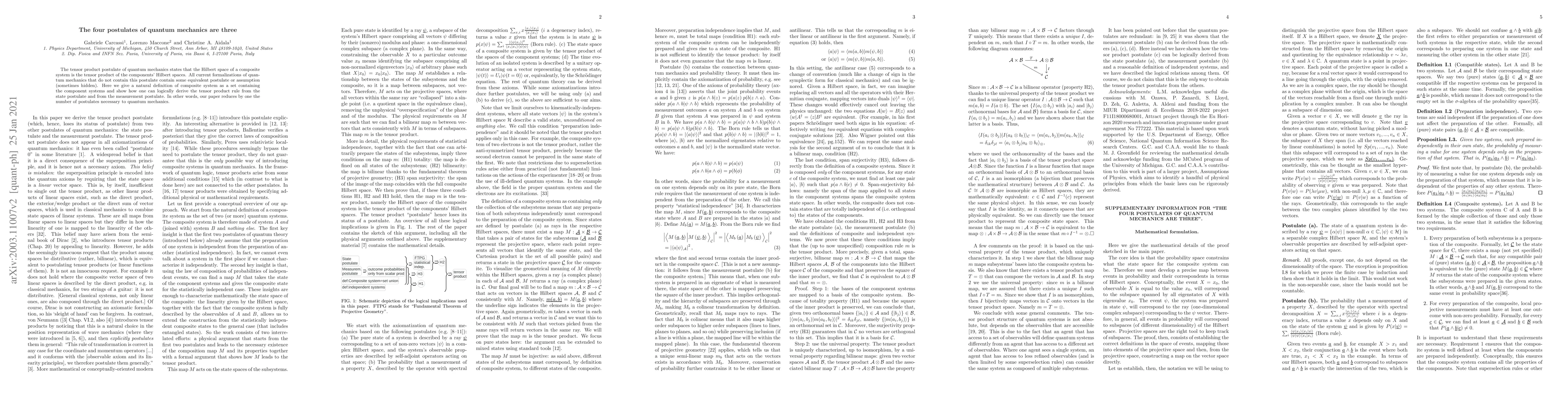 This paper argues that the four traditional postulates of quantum mechanics can be reduced to three by deriving the tensor product postulate from the state and measurement postulates, thus eliminating the need for a separate tensor product postulate.
