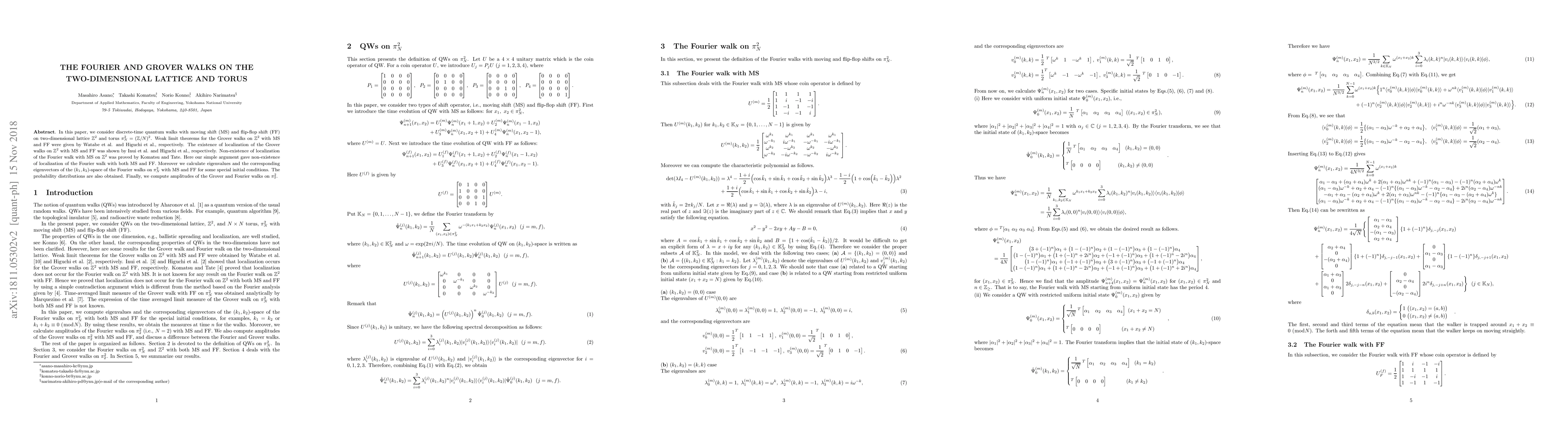 This paper studies discrete-time quantum walks on 2D lattices and tori, exploring localization and eigenvalues of the Grover and Fourier walks with different shift rules.