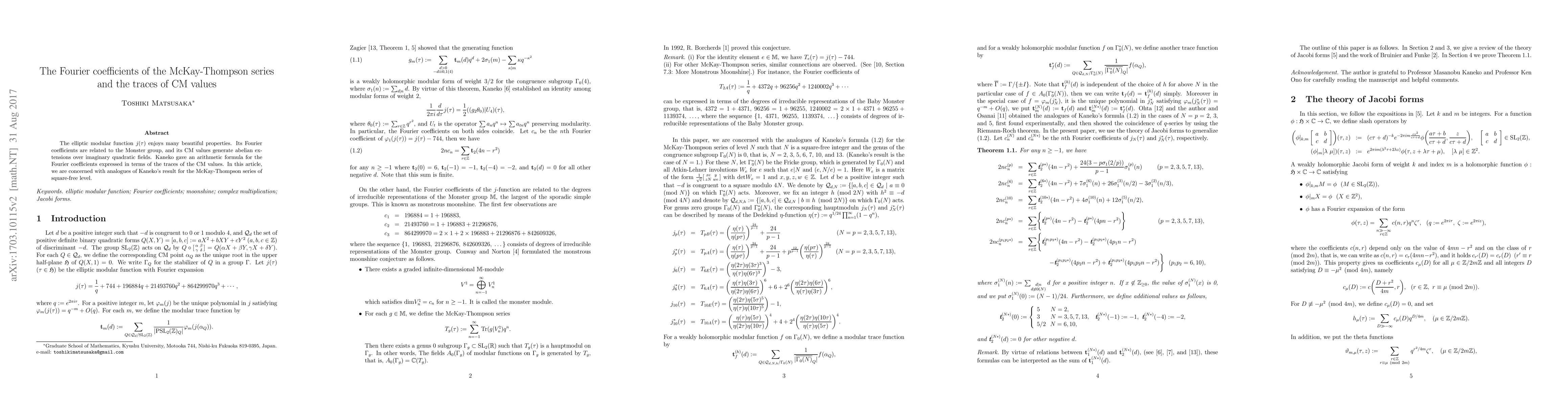 The elliptic modular j function enjoys many beautiful properties. Its Fourier coefficients are related to the Monster group, and its CM values generate abelian extensions over imaginary quadratic fields. Kaneko gave an arithmetic formula for the Fourier coefficients expressed in terms of the traces of the CM values. In this article, we are concerned with analogues of Kaneko's result for the McKay-Thompson series of square-free level.