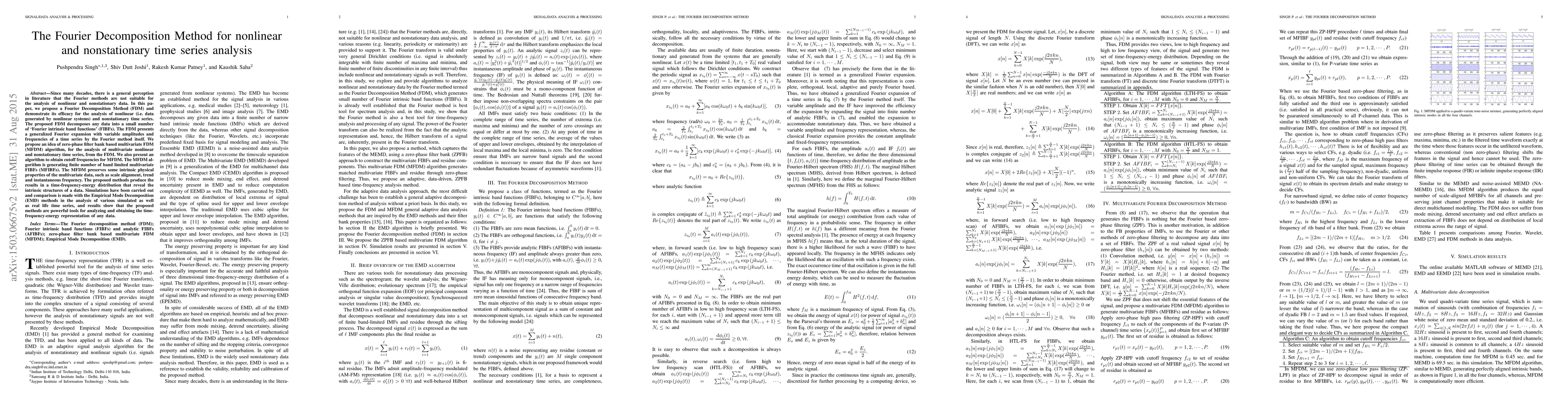 This paper proposes a Fourier Decomposition Method (FDM) for analyzing nonlinear and nonstationary time series by decomposing data into Fourier intrinsic band functions. The method, including a multivariate FDM (MFDM) algorithm, preserves intrinsic properties and reveals data structures in time-frequency-energy distribution, outperforming Empirical Mode Decomposition (EMD) in simulations and real-life data analysis.