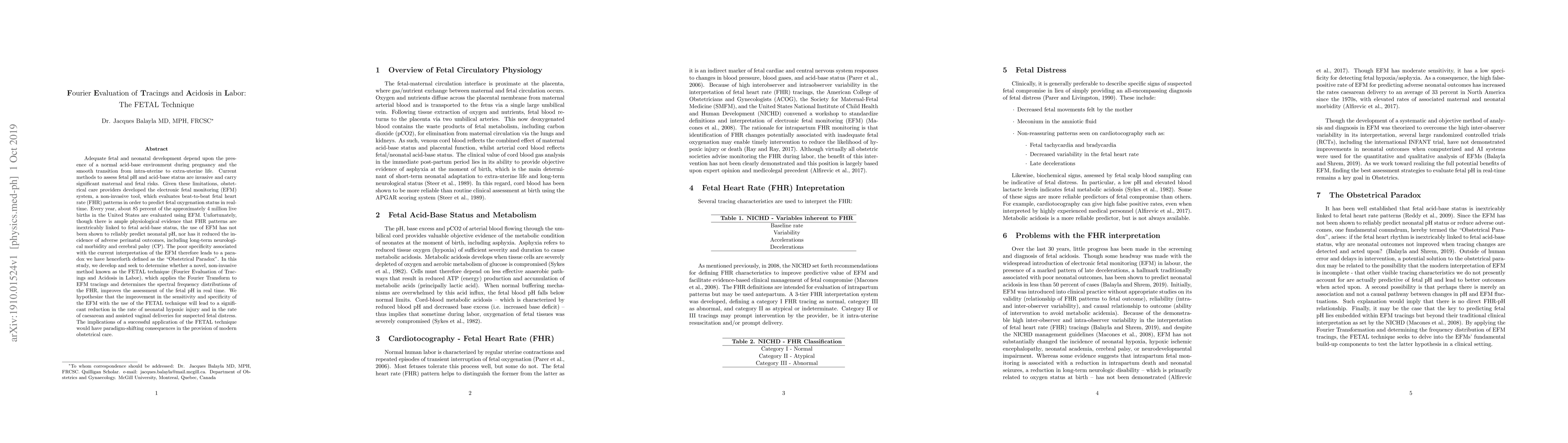 Adequate fetal and neonatal development depend upon the presence of a normal acid-base environment during pregnancy and the smooth transition from intra-uterine to extra-uterine life. Current methods to assess fetal pH and acid-base status are invasive and carry significant maternal and fetal risks. Given these limitations, obstetrical care providers developed the electronic fetal monitoring (EFM) system, a non-invasive tool, which evaluates beat-to-beat fetal heart rate (FHR) patterns in order to predict fetal oxygenation status in real-time. Every year, about 85 percent of the approximately 4 million live births in the United States are evaluated using EFM. Unfortunately, though there is ample physiological evidence that FHR patterns are inextricably linked to fetal acid-base status, the use of EFM has not been shown to reliably predict neonatal pH, nor has it reduced the incidence of adverse perinatal outcomes, including long-term neurological morbidity and cerebral palsy (CP). The poor specificity associated with the current interpretation of the EFM therefore leads to a paradox we have henceforth defined as the Obstetrical Paradox. In this study, we develop and seek to determine whether a novel, non-invasive method known as the FETAL technique (Fourier Evaluation of Tracings and Acidosis in Labor), which applies the Fourier Transform to EFM tracings and determines the spectral frequency distributions of the FHR, improves the assessment of the fetal pH in real time. We hypothesize that the improvement in the sensitivity and specificity of the EFM with the use of the FETAL technique will lead to a significant reduction in the rate of neonatal hypoxic injury and in the rate of caesarean deliveries for suspected fetal distress. The implications of a successful application of the FETAL technique would have paradigm-shifting consequences in the provision of modern obstetrical care.