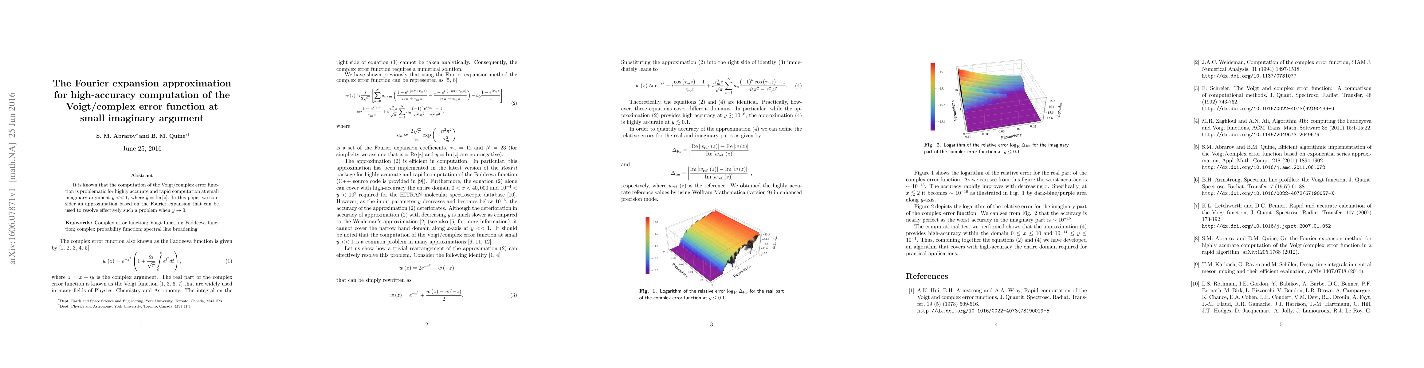 This paper proposes a Fourier expansion approximation for high-accuracy computation of the Voigt/complex error function at small imaginary arguments, addressing the computational challenges that arise when $y \to 0$. The method aims to provide rapid and precise results in such scenarios.