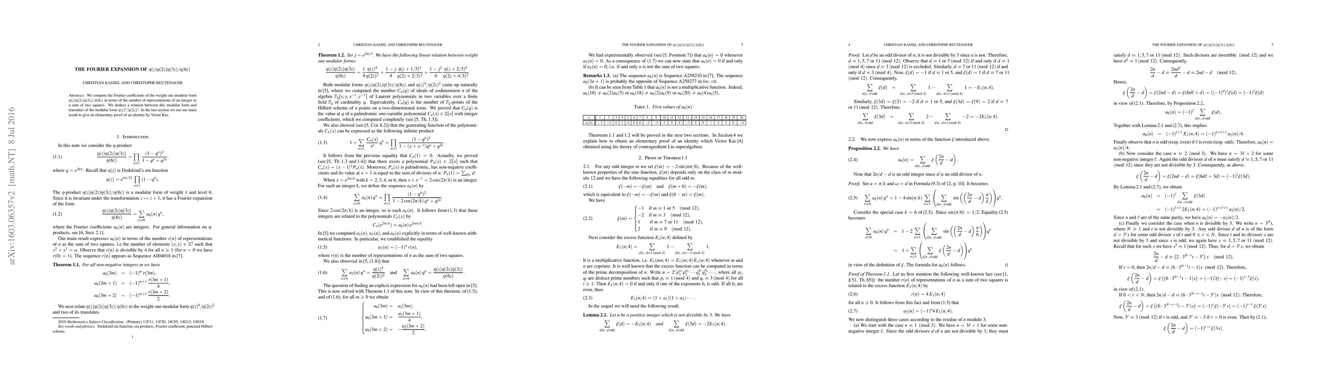 We compute the Fourier coefficients of the weight one modular form $\eta(z)\eta(2z)\eta(3z)/\eta(6z)$ in terms of the number of representations of an integer as a sum of two squares. We deduce a relation between this modular form and translates of the modular form $\eta(z)^4/\eta(2z)^2$. In the last section we use our main result to give an elementary proof of an identity by Victor Kac.