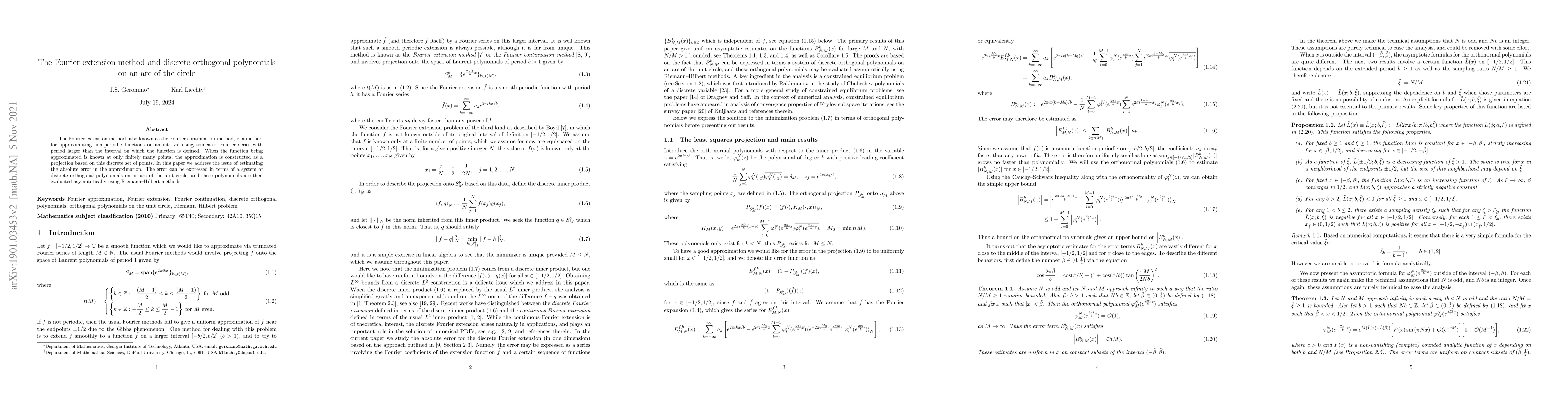 This paper explores the Fourier extension method for approximating non-periodic functions using truncated Fourier series, focusing on estimating the absolute error based on a finite set of points. The error is analyzed through discrete orthogonal polynomials on an arc of the unit circle, evaluated asymptotically with Riemann-Hilbert methods.