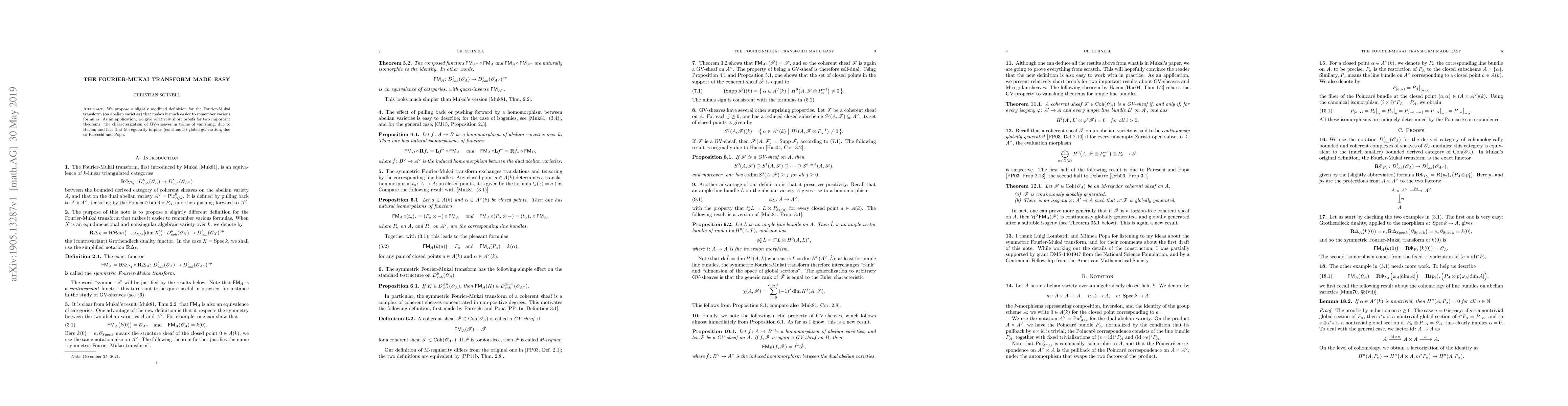 This paper presents a simplified definition of the Fourier-Mukai transform on abelian varieties to enhance memorization of related formulas. It also provides concise proofs for Hacon's characterization of GV-sheaves and the theorem that M-regularity implies continuous global generation by Pareschi and Popa.