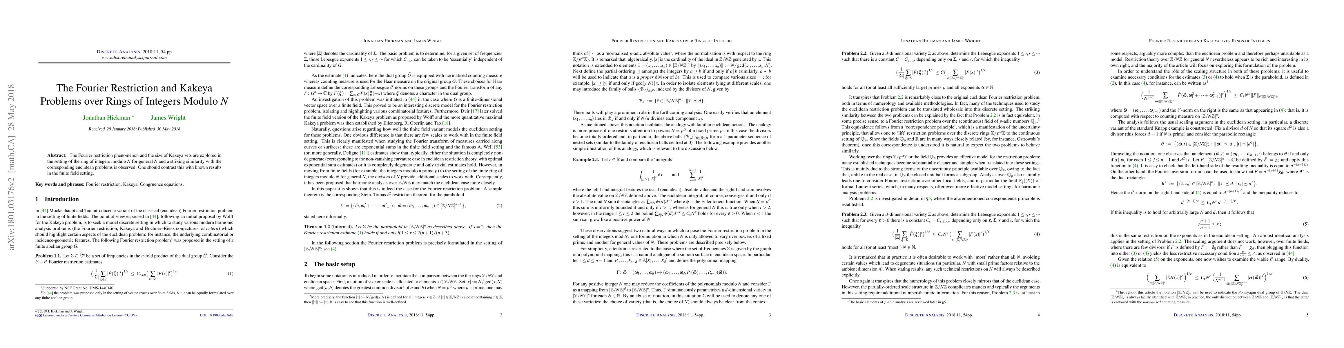 The Fourier restriction phenomenon and the size of Kakeya sets are explored in the setting of the ring of integers modulo $N$ for general $N$ and a striking similarity with the corresponding euclidean problems is observed. One should contrast this with known results in the finite field setting.