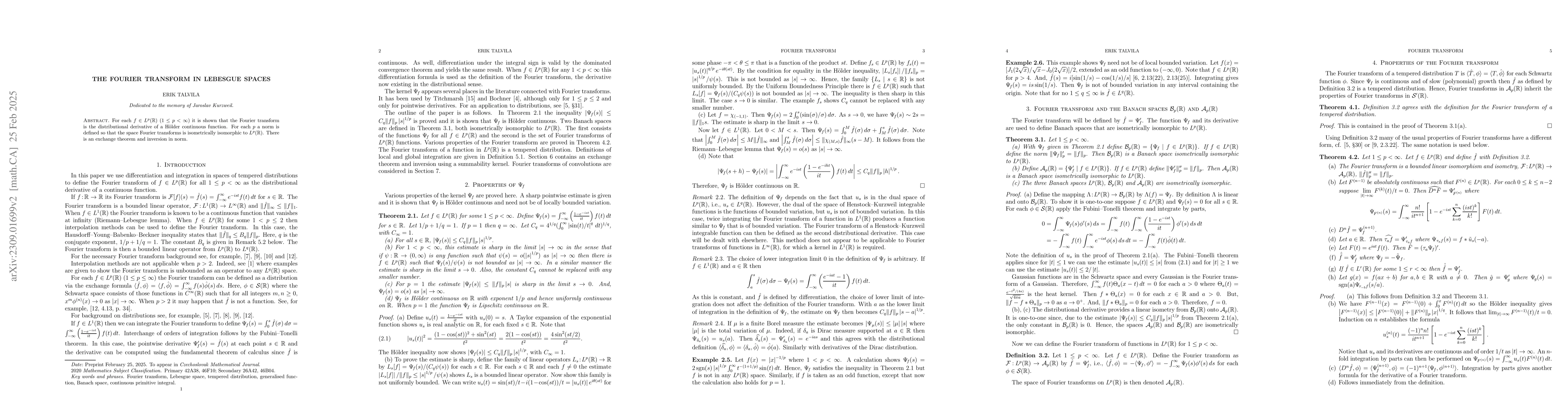 For each $f\in L^p({\mathbb R)}$ ($1\leq p<\infty$) it is shown that the Fourier transform is the distributional derivative of a H\"older continuous function. For each $p$ a norm is defined so that the space Fourier transforms is isometrically isomorphic to $L^p({\mathbb R)}$. There is an exchange theorem and inversion in norm.