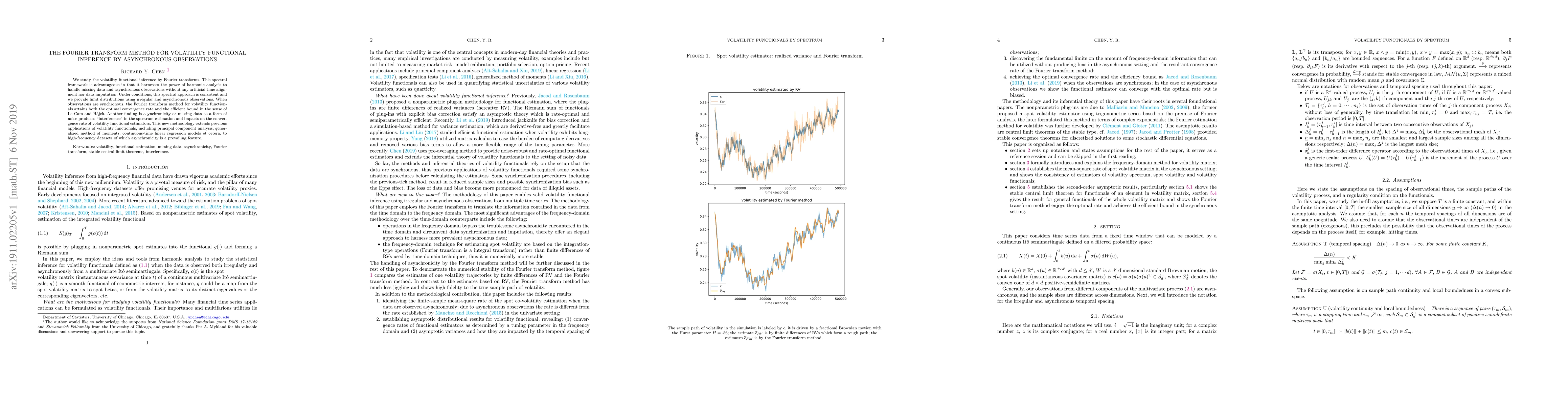 We study the volatility functional inference by Fourier transforms. This spectral framework is advantageous in that it harnesses the power of harmonic analysis to handle missing data and asynchronous observations without any artificial time alignment nor data imputation. Under conditions, this spectral approach is consistent and we provide limit distributions using irregular and asynchronous observations. When observations are synchronous, the Fourier transform method for volatility functionals attains both the optimal convergence rate and the efficient bound in the sense of Le Cam and H\'ajek. Another finding is asynchronicity or missing data as a form of noise produces "interference" in the spectrum estimation and impacts on the convergence rate of volatility functional estimators. This new methodology extends previous applications of volatility functionals, including principal component analysis, generalized method of moments, continuous-time linear regression models et cetera, to high-frequency datasets of which asynchronicity is a prevailing feature.